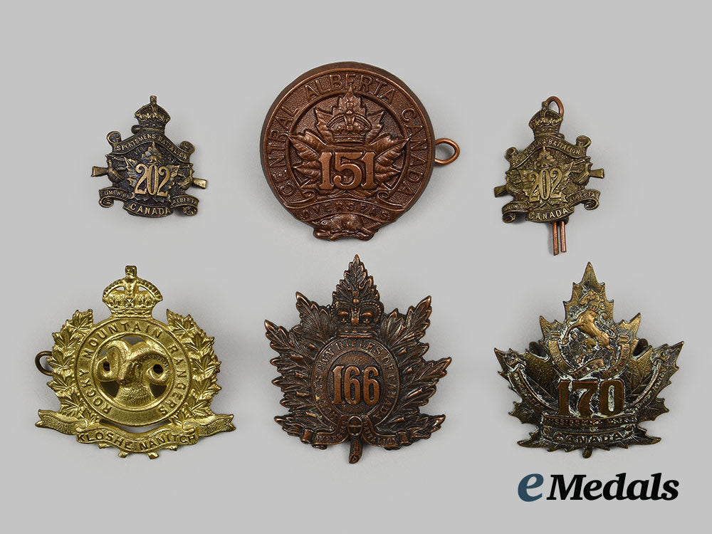 1. 151st Infantry Battalion, "151st Central Albert Battalion" Cap Badge: in bronze, maker marked "JACKSON BROS" on the reverse, measuring 41.3 mm (w) x 43.2 mm (h), both lugs and pin intact.