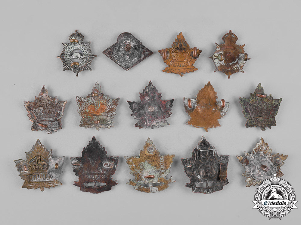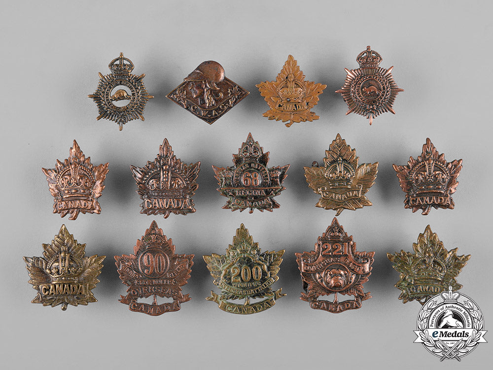 68th Infantry Battalion "Regina Battalion" Collar Tab (in pickled copper, measuring 28.8 mm (w) x 29.7 mm (h), lugs severed and replaced by a screw); 90th Infantry Battalion "Winnipeg Rifles" Collar Tab (in pickled copper, maker marked "DINGWALL WINNIPEG" on the reverse, measuring 30 mm (w) x 35.5 mm (h), both lugs severed); 200th Infantry Battalion "Winnipeg Battalion" Collar Tab (in pickled copper, maker marked "BIRKS 1916" on the reverse, measuring 31 mm (w) x 34 mm (h), one of two lugs intact); 221st Infantry Battalion Collar Tab (in pickled copper, measuring 30.3 mm (w) x 35.7 mm (h), one of two prongs intact); three Canada General Service Collar Tabs (in brass, one is maker marked "SCULLY LTD MONTREAL" on the reverse, measuring 31.2 mm (w) x 30.5 mm (h), lugs severed and replaced by a screw; one is unmarked, measuring 31.3 mm (w) x 32.3 mm (h), both lugs intact; one is unmarked, measuring 28.2 mm (w) x 31 mm (h), both lugs intact).