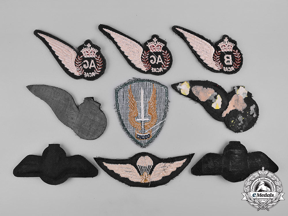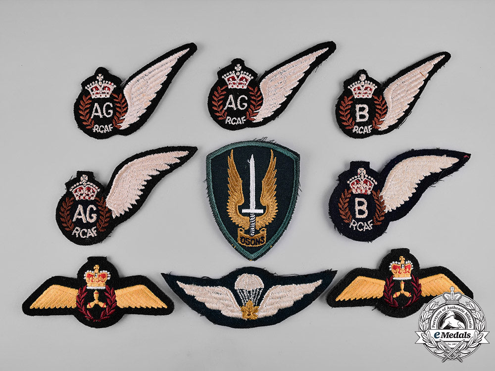 Seven Royal Canadian Air Force Badges: three Air Gunner (AG) Wings (in red, white and brown embroidery, on a black wool base, black cotton mesh backer, two measuring 97 mm (w) x 48 mm (h) and one measuring 108 mm (w) x 50 mm (h), the latter badge with paper and glue residue evident on the reverse from previous board mounting); two Bombardier (B) Wings (in red, white and brown embroidery, on a black wool base, black cotton mesh backer, one measuring 95 mm (w) x 48 mm (h), the other measuring 110 mm (w) x 55 mm (h), the large badge with paper and glue residue evident on the reverse from previous board mounting); and two Flight Engineer Badges Post-1986 (in red, white, yellow and maroon embroidery, on a black wool base, padded, black cotton backer, measuring 114 mm (w) x 49 mm (h) each).