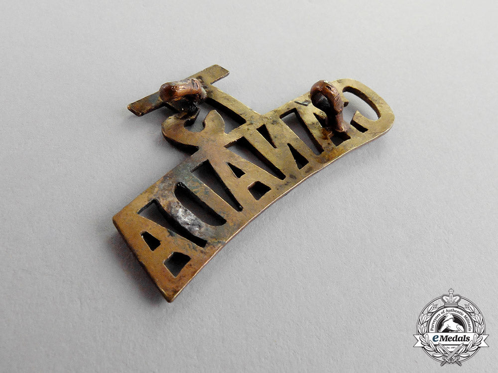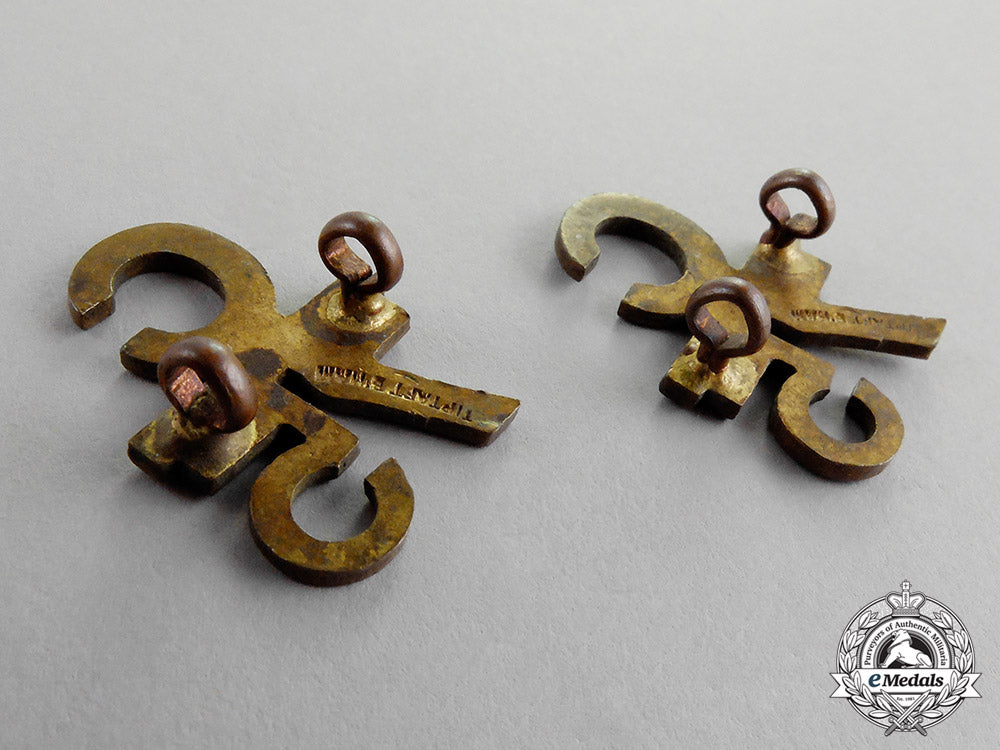 Canada; Shoulder Title (browning copper, unmarked, 43 mm (w) x 22.2 mm (h), two of three lugs intact); and Collar Tab Pair (browning copper, maker marked "TIPTAFT B'HAM" on their reverses, 19 mm (w) x 26 mm (h), both with intact lugs). Ranging from very fine to near extremely fine.