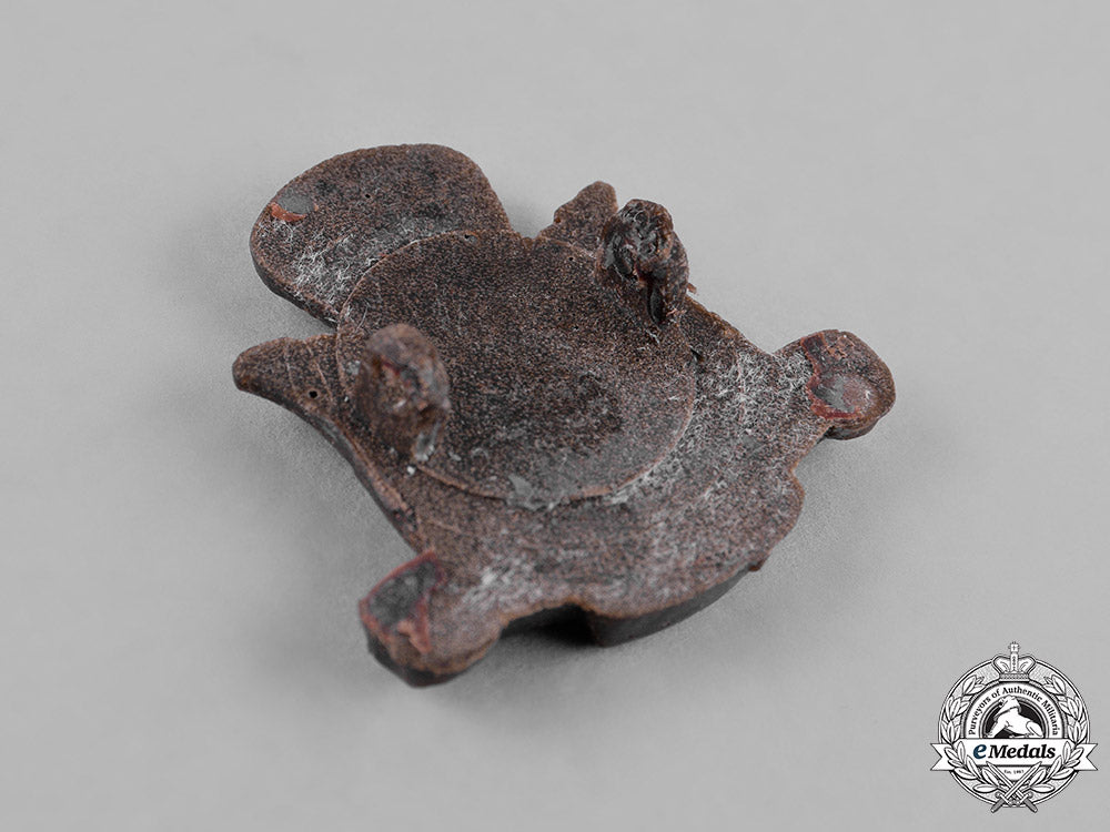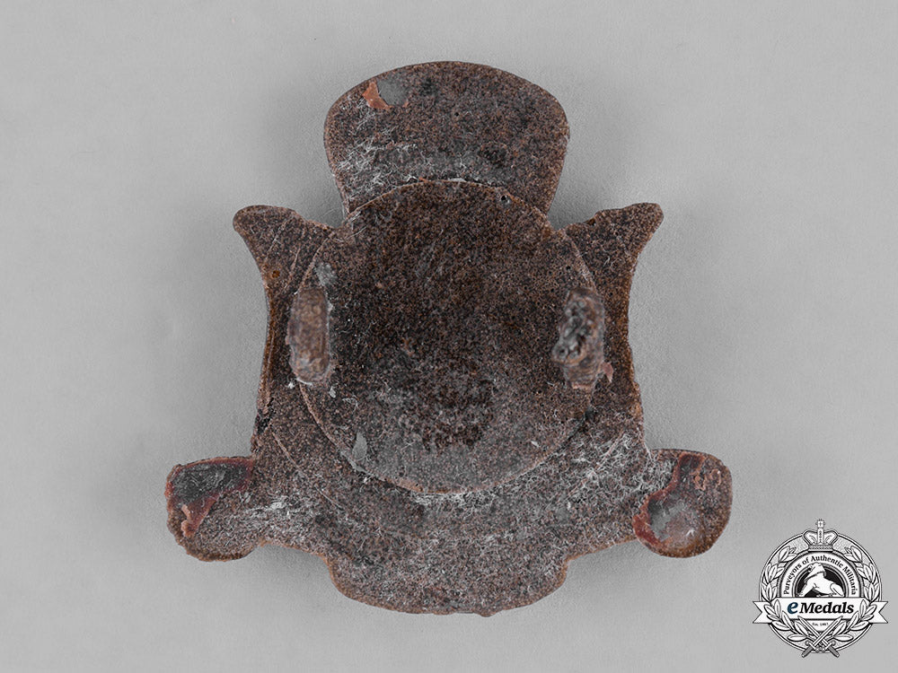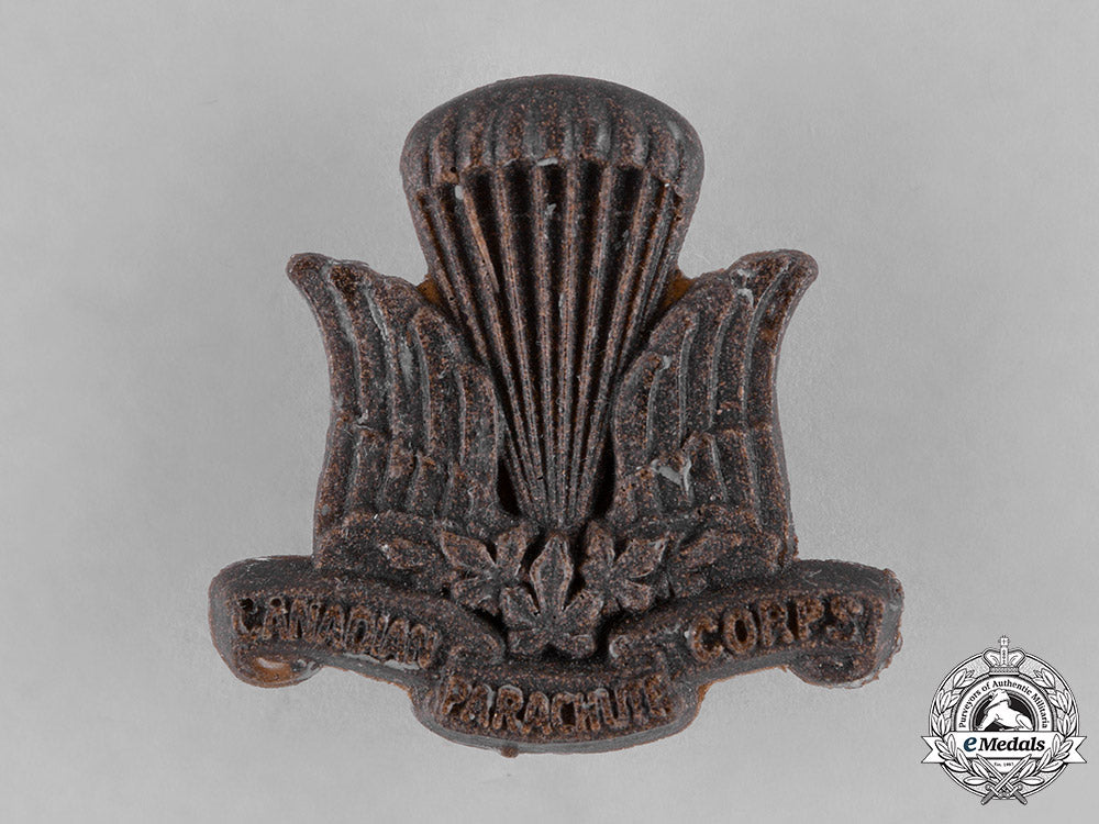 Footnote: Cap badges were usually made of white metal, brass, copper or bi-metal. Most commonly brass and white metal were used. With the shortage of ferrous metal towards the end of 1940, an alternative material was needed for the manufacture of cap badges. Rolled brass and bakelite were among the materials tested but it was cellulose acetate that was finally selected, as it was a modern plastic that could be used with injection molding equipment. The first cellulose acetate badges were produced in December of 1941 and were limited to the corp. level, with the regimental level badges going into production in June of 1942. Since the average soldier preferred the metal badges over the plastic and they were produced for a short period of time, plastic cap badges can be fairly rare.