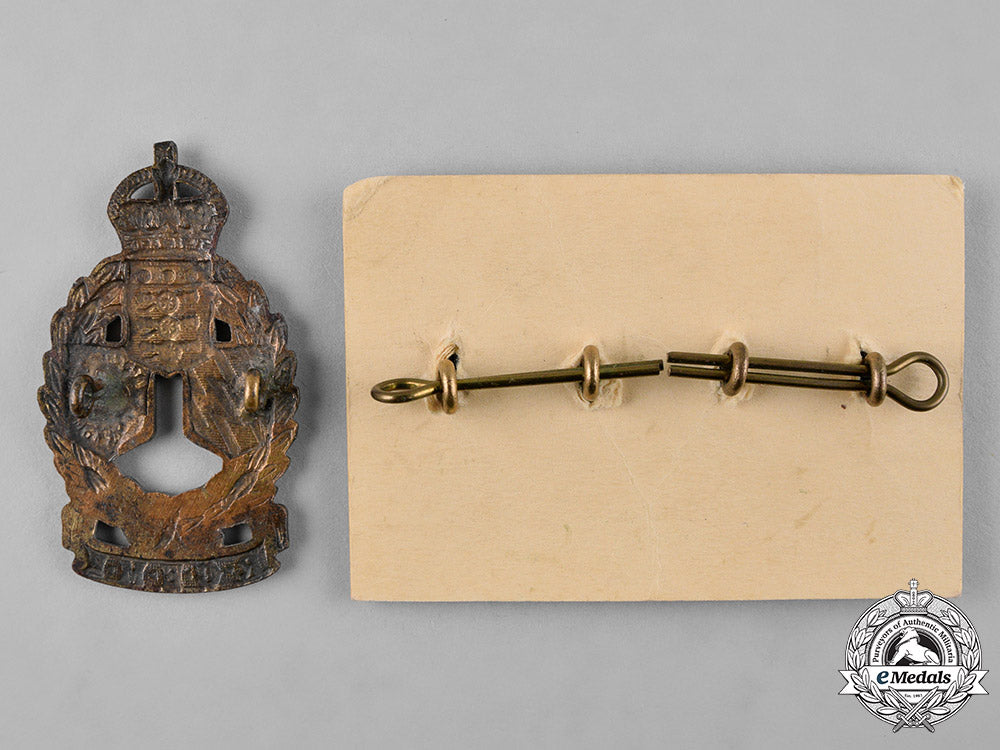 Cap Badge: in bronze gilt, voided, maker marked "W. SCULLY MONTREAL" on the reverse, measuring 29.8 mm (w) x 51 mm (h), both lugs intact, scattered gilt wear; and Collar Tab Pair: in bronze gilt, voided, measuring 22.2 mm (w) c 37.7 mm (h) each, intact lugs and pins, on their card of issue. Near extremely fine.