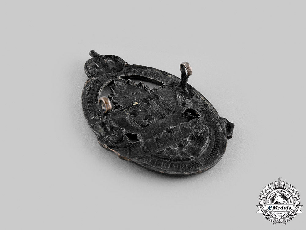 In pickled copper, voided, maker marked "D.E. BLACK" on the reverse, measuring 40 mm (w) x 58.7 mm (h), both lugs intact, scattered pickling wear, near extremely fine.