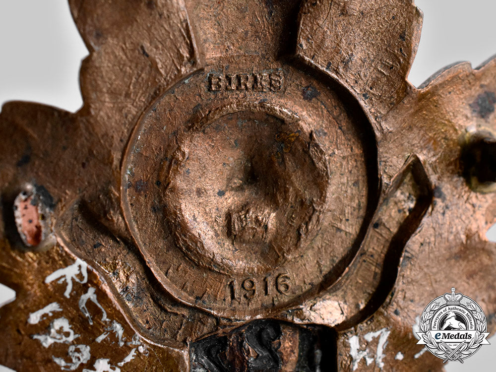Four-piece construction, three individual numbers (1, 2 and 7) in silver, affixed to a browning copper base, maker marked "BIRKS", dated "1916" and museum coded in white on the reverse, measuring 45.5 mm (w) x 45.7 mm (h), one of two lugs intact, fine.