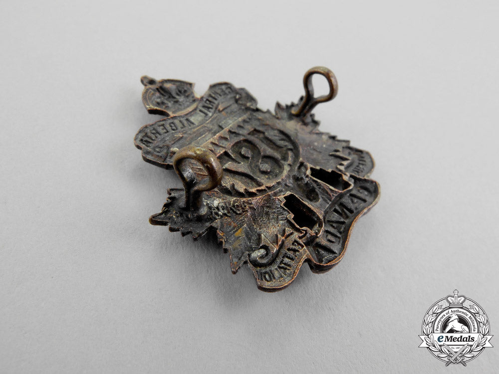 Canada; Three-piece construction, silver "187" with deer's head and silver "CANADA" scroll, mounted to a browning copper base, maker marked "BLACKS Co." on the reverse, 32.8 mm (w) x 36 mm (h), both lugs intact, extremely fine.