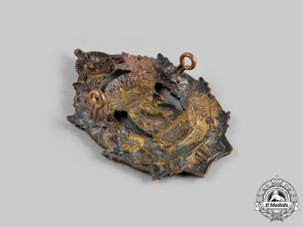 In pickled copper, voided, maker marked "CRICHTON'S MOOSE JAW" on the reverse, measuring 40.2 mm (w) x 47.7 mm (h), both lugs intact, extremely fine.
