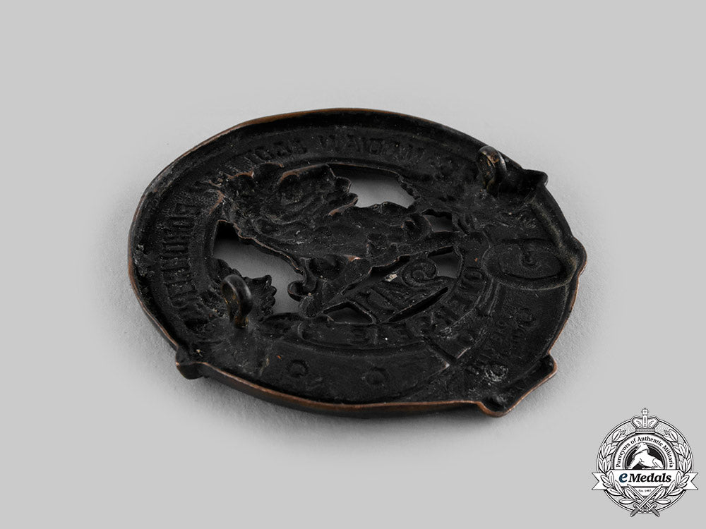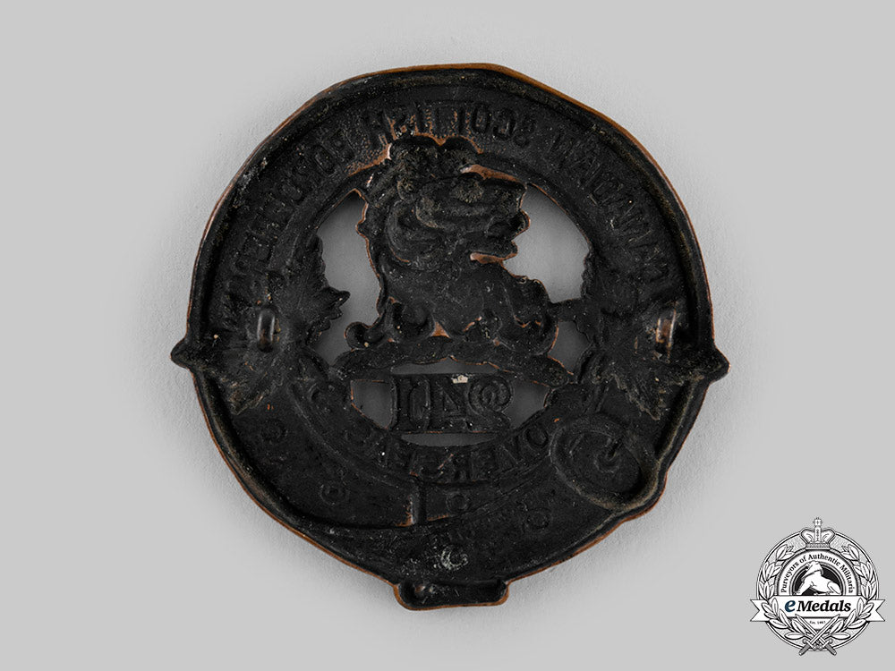 "Canadian Scottish Borderers". In browning copper, voided, maker marked "ELLIS BROS TORONTO" on the reverse, measuring 58.7 mm (w) x 57.3 mm (h), both lugs intact, surface wear, rim slightly undulated, better than very fine.