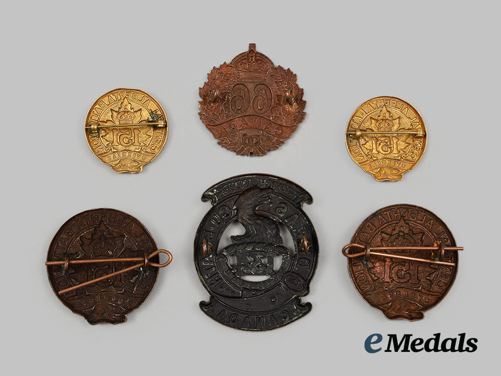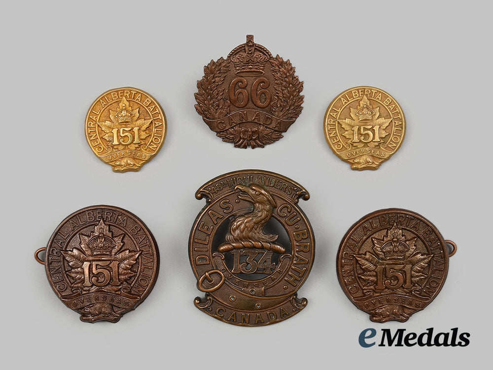 1. 66th Infantry Battalion Cap Badge: in browning copper, maker marked "JACKSON BROS. 1916" on the reverse, measuring 41 mm (w) x 43 mm (h), both lugs intact.