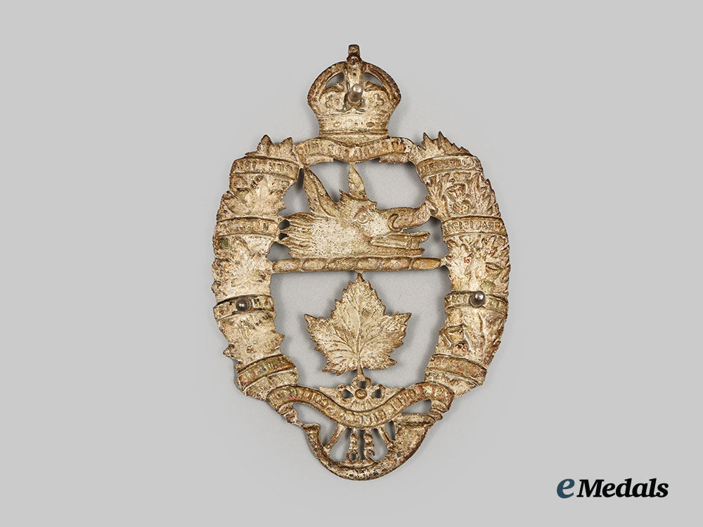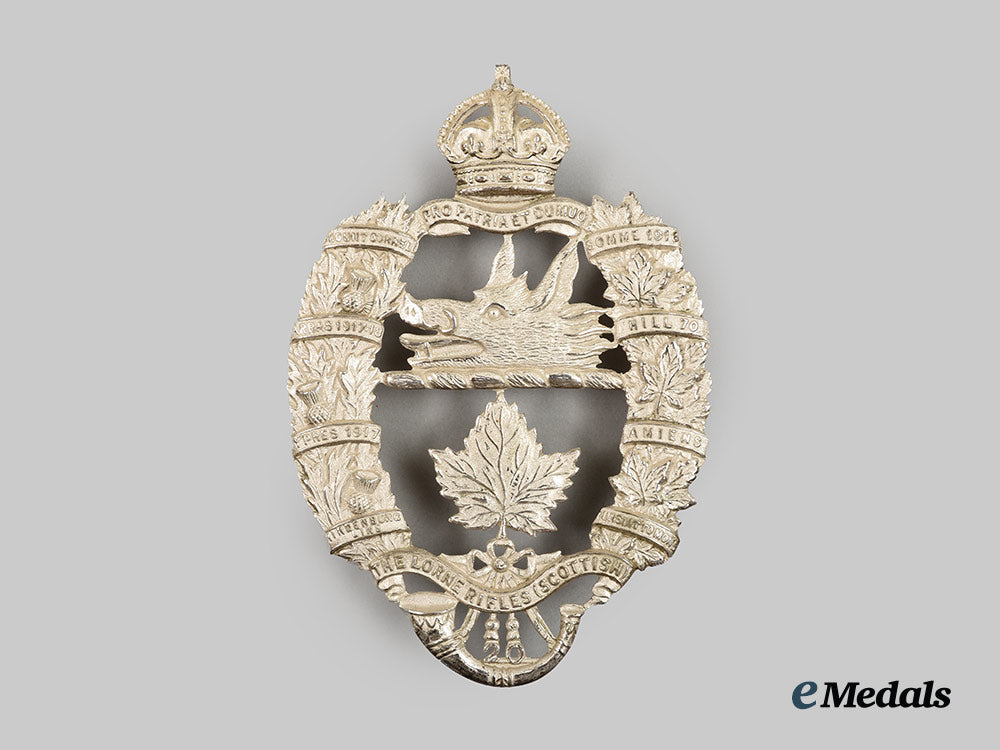 Silvered (silvered brass) regimental badge, the obverse centerpiece bearing the boar’s head crest of the Argyll family, a maple leaf, a scroll inscribed THE LORNE RIFLES (SCOTTISH), and a bugle horn, flanked by oak and maples leaves wrapped within scrolls inscribed MOUNT SORREL, SOMME 1916, ARRAS 1917-18, HILL 70, YPRES 1917, AMIENS, HINDENBURG LINE, and PURSUIT TO MONS, topped by a crown and scroll inscribed PRO PATRIA ET DU MUO, 11.1 cm (h) x 7.6 cm (w), very fine condition.