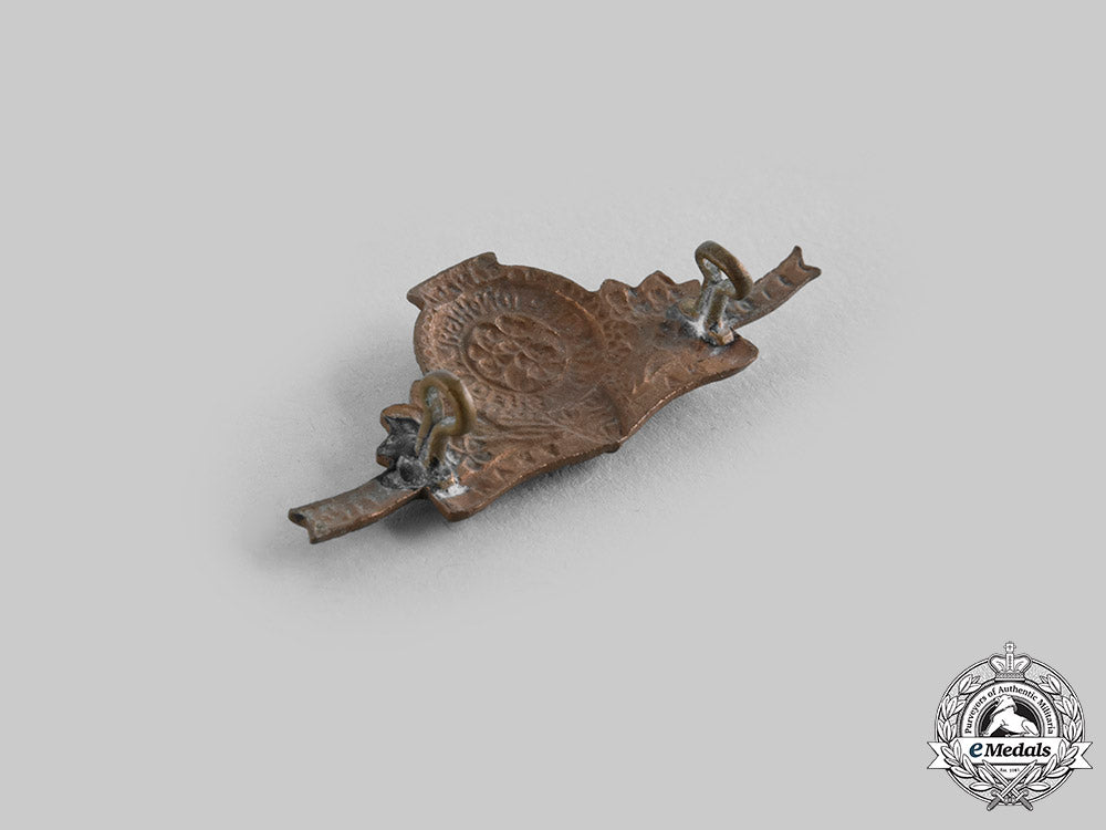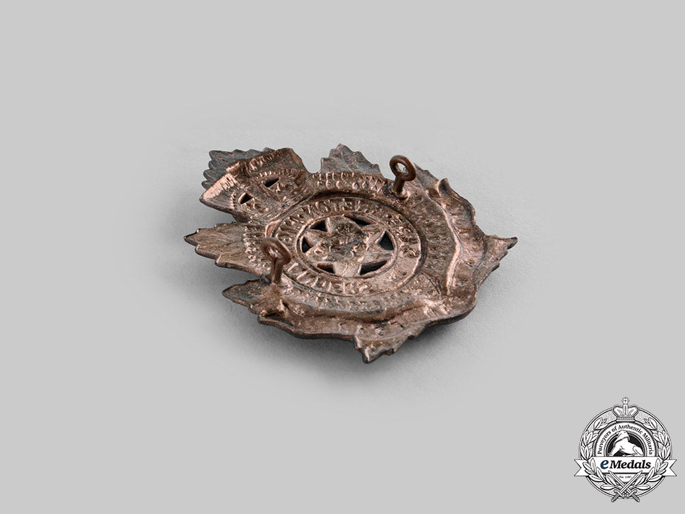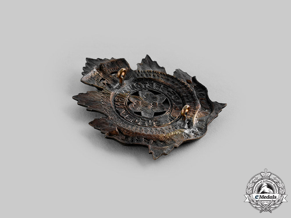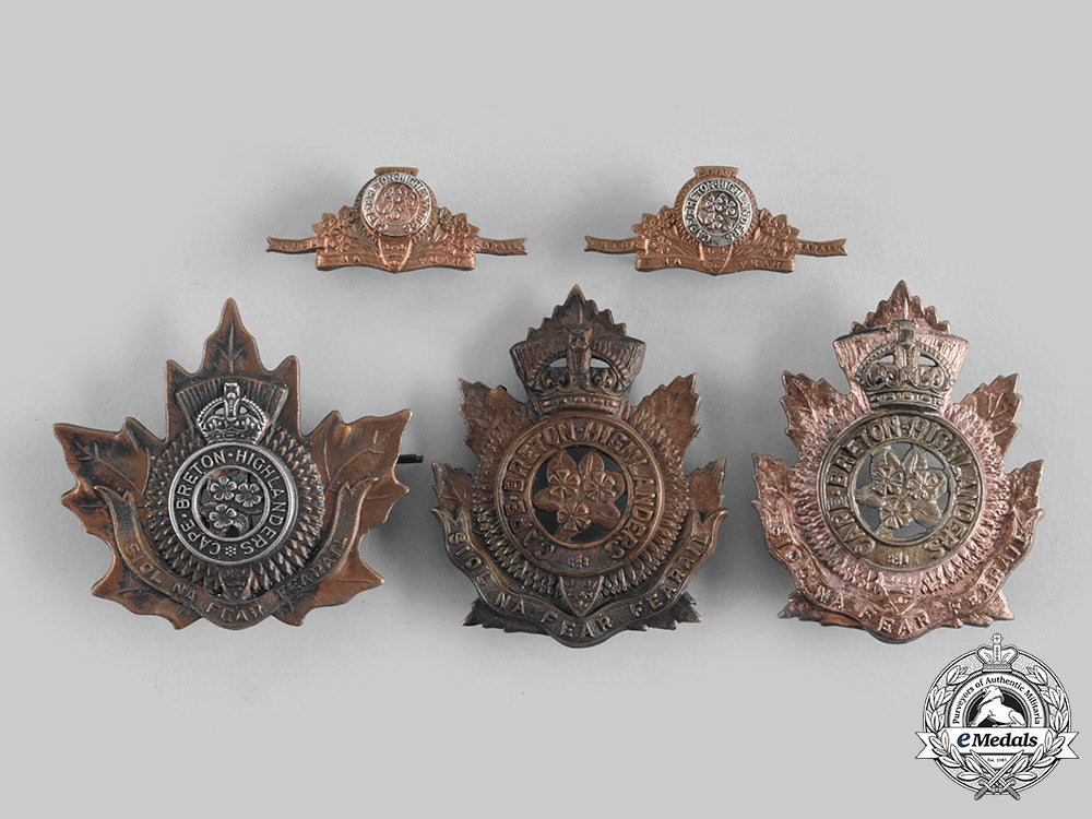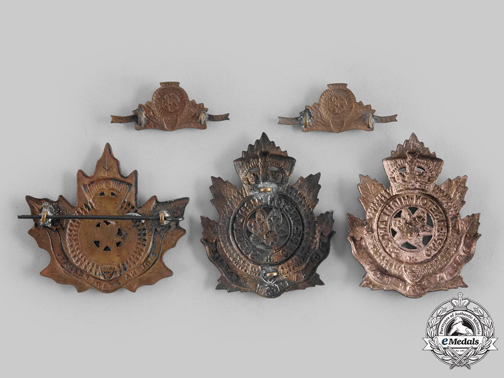 Two Second Pattern Glengarry Badges (one with a two-piece construction with a white metal insignia, mounted to a bronze gilt base, the other is in one piece, in bronze, both are voided, unmarked, measuring 54 mm (w) x 65.5 mm (h) each, both with intact lugs); Third Pattern Post-1949 Glengarry Badge (two-piece construction, white metal insignia, mounted to a bronze base, voided, unmarked, measuring 65 mm (w) x 59.5 mm (h), both lugs and pin intact, the one pin having been re-soldered in place); and two Collar Badges (two-piece construction, silvered copper insignia, mounted to a browning copper base, unmarked, measuring 47.5 mm (w) x 19.8 mm (h) each, intact lugs, silvering wear evident on one insignia). Ranging from better than very fine to extremely fine.