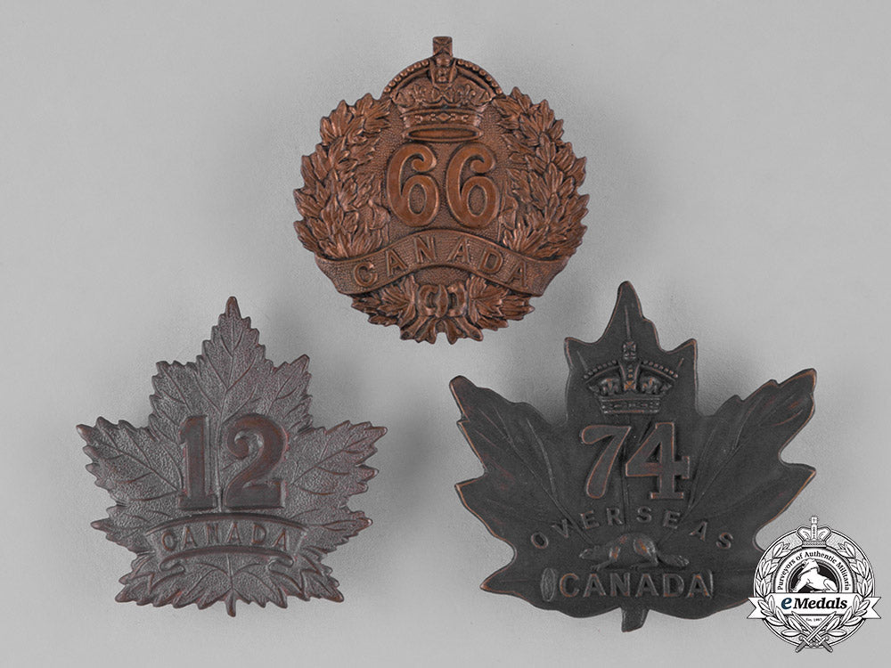 Includes: 12th Infantry Battalion Cap Badge (in browning copper, unmarked, measuring 43.8 mm (w) x 44.8 mm (h), both lugs intact); 66th Infantry Battalion Cap Badge (in browning copper, maker marked "JACKSON BROS 1916" on the reverse, measuring 41 mm (w) x 43 mm (h), both lugs intact); and 74th Infantry Battalion Cap Badge (in browning copper, maker marked "TIPTAFT B'HAM" on the reverse, measuring 51 mm (w) x 49 mm (h), both lugs intact). Very light contact, near extremely fine.