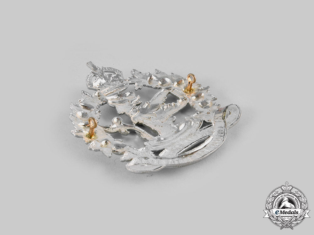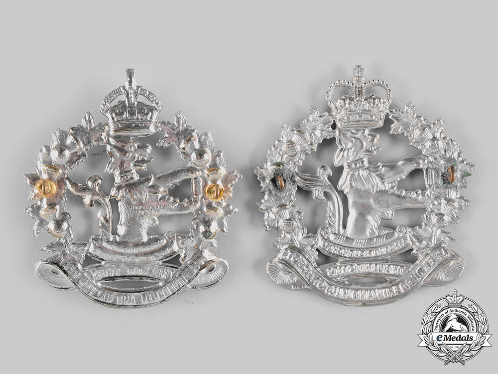 Glengarry Badge with King's Crown (in white metal, vopided, unmarked, measuring 70 mm (w) x 76.5 mm (h), both lugs intact); and Glengarry Badge with Queen's Crown (in white metal, vopided, maker marked "C.A.D. 83" on the reverse, measuring 72.5 mm (w) x 78 mm (h), both lugs intact). Very light contact, near extremely fine.