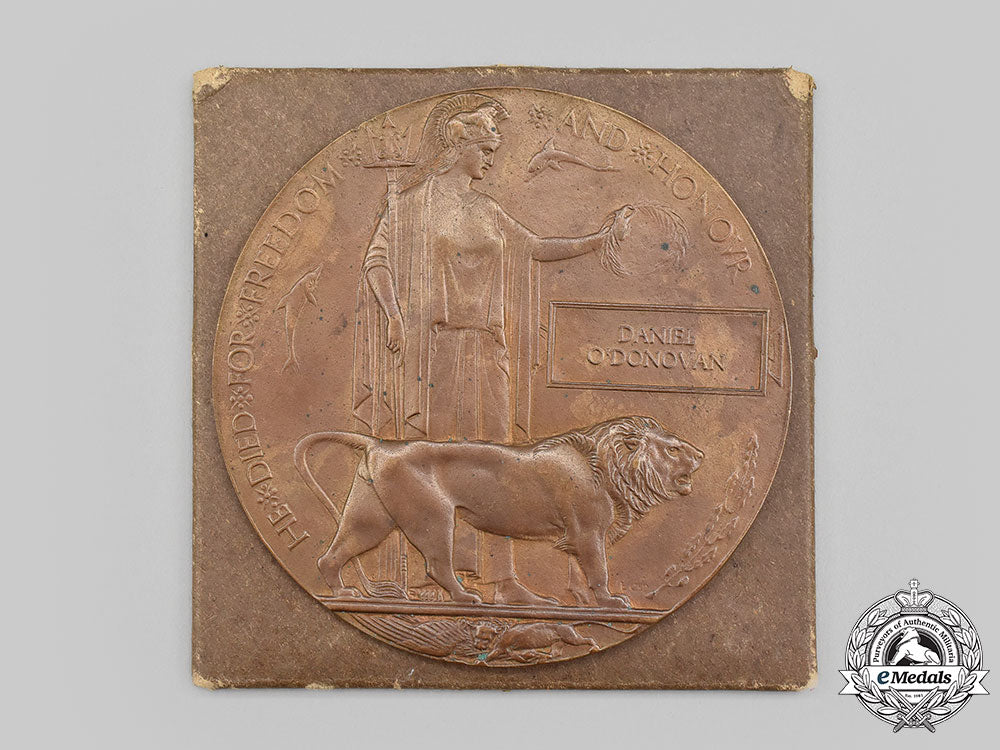 (DANIEL O'DONOVAN). In bronze, the naming in raised capital letters, obverse designer marked "E.Cr.P.", reverse maker marked "WA" (Royal Arsenal, Woolwich: identified by a circle containing the initials "WA" with the "A" being formed by a bar between the two upward strokes of the "W"), measuring 120.5 mm in diameter, exhibiting spotting, along with its original brown cardboard container, near extremely fine.