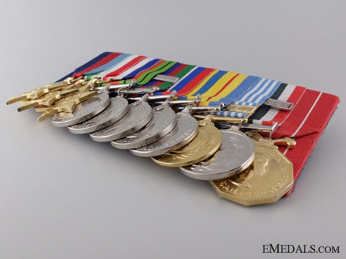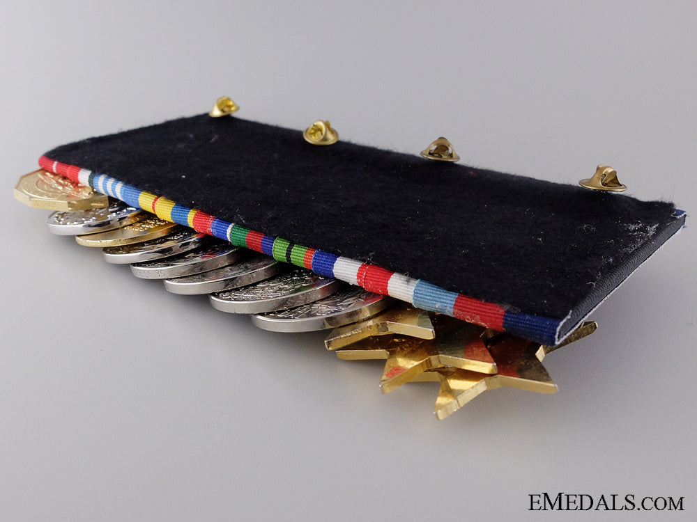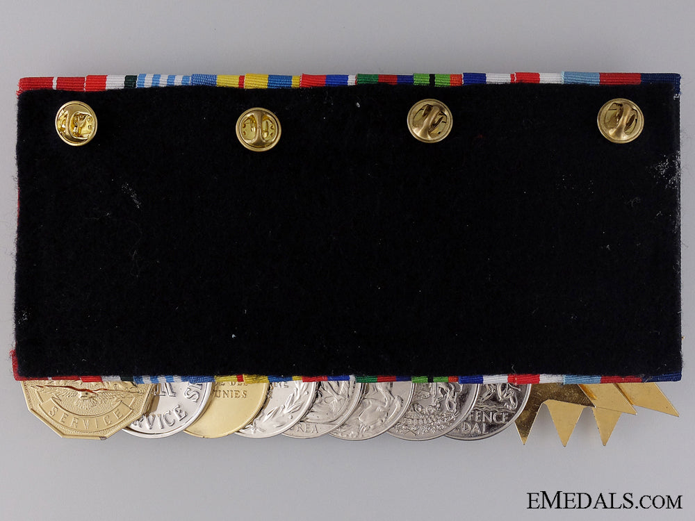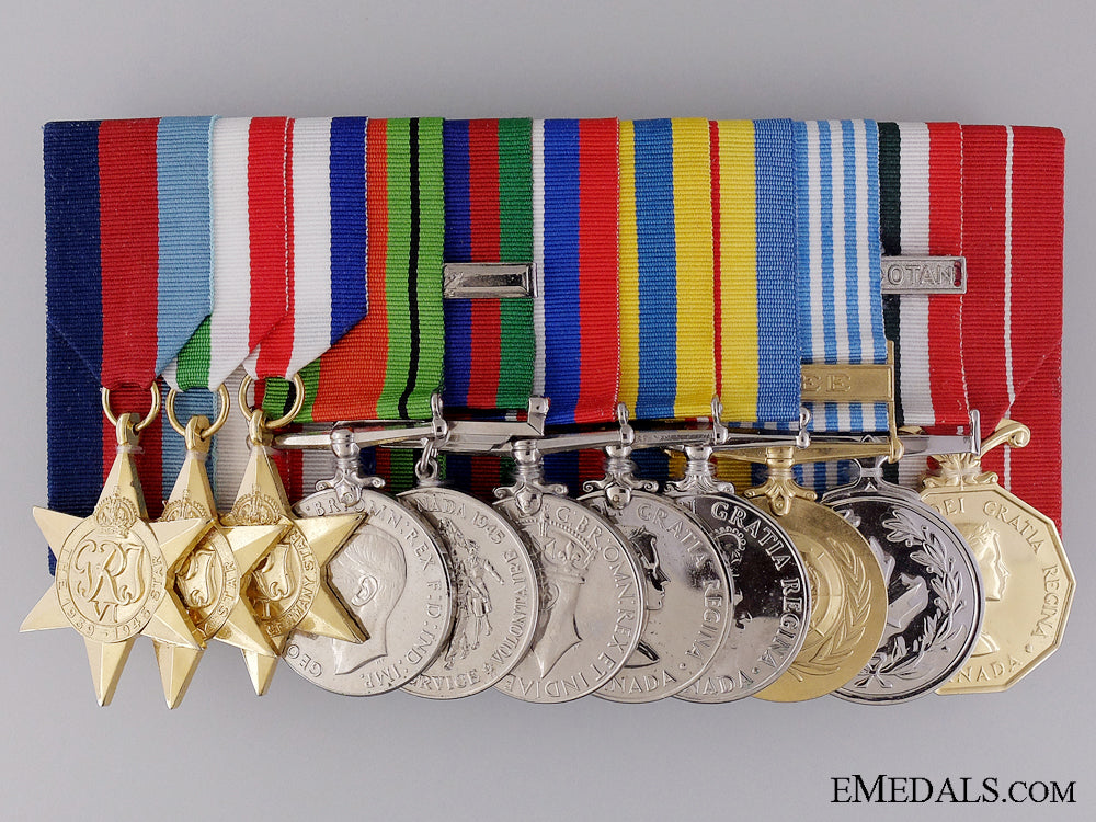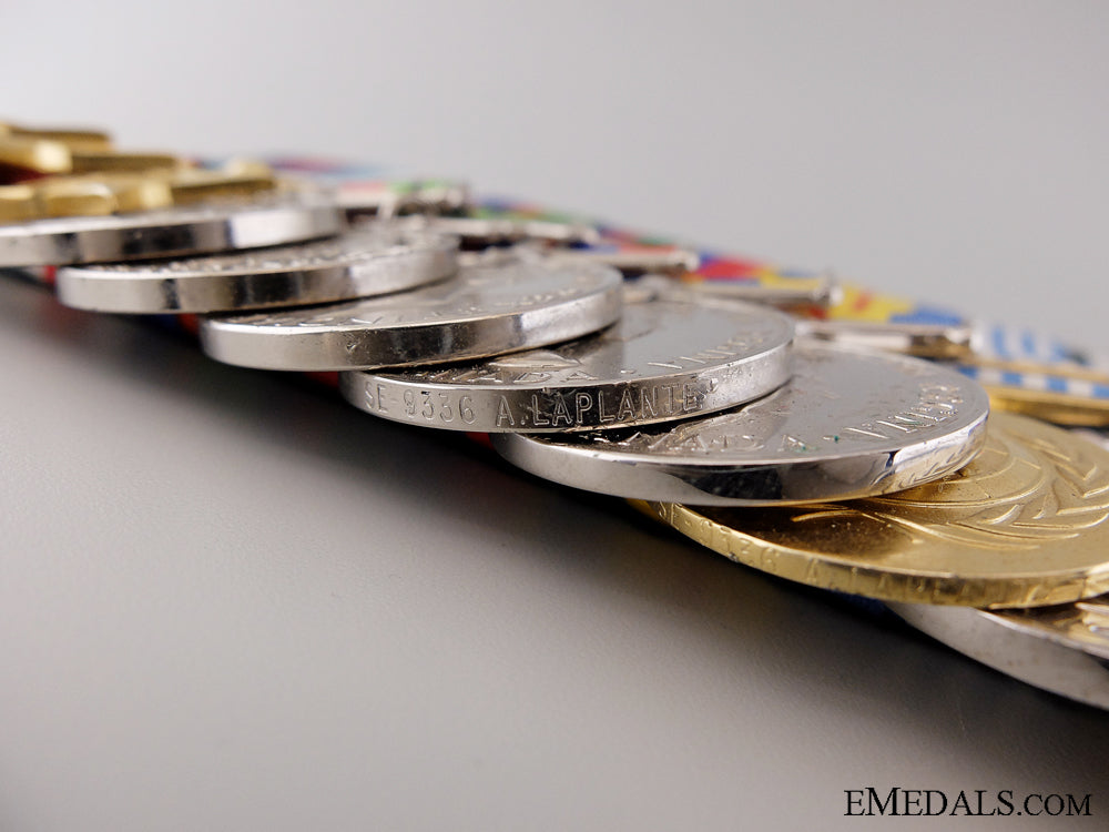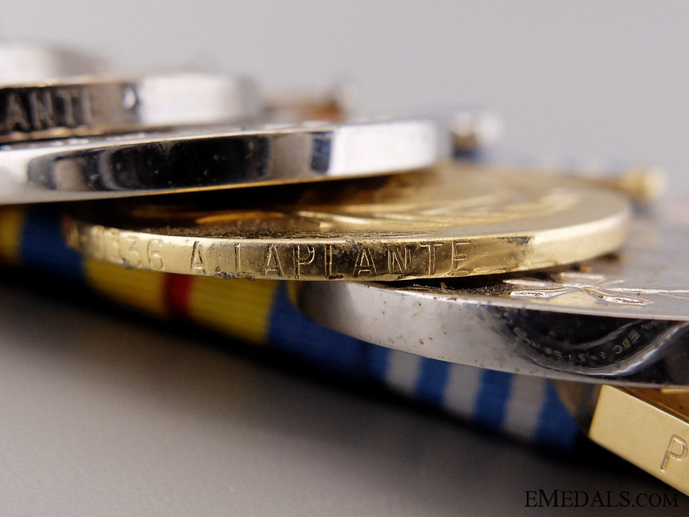 A Canadian Korean War Group to the 22nd Regiment - 1939-1945 Star; Italy Star; France and Germany Star; Defence Medal; Canadian Volunteer Service Medal with Overseas Clasp; War Medal 1939-1945; Korea Medal (SE-9336 A. LAPLANTE); Canadian Volunteer Service Medal for Korea; United Nations Korea Medal (SE-9336 A. LAPLANTE); Special Service Medal; and Canadian Forces' Decoration, QEII (PTE A. LAPLANTE). Naming is officially impressed on the KM, privately engraved on the UNKM and officially engraved on the edge of the CFD. Court-mounted, quadruple push pins on the reverse, light contact, plated, near extremely fine. Accompanied by copies of his Attestation Papers, Service Records, Discharge Certificate, Medal Awards Card, Applications for the Award of the Korea Medal, the United Nations Korea Service Medal and the Canadian Forces' Decoration, Statements of Service in the Canadian Armed Forces and assorted letters of correspondence.