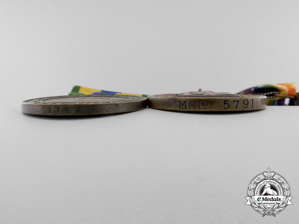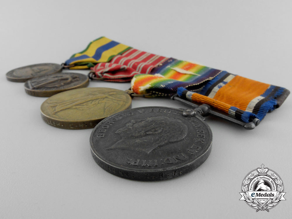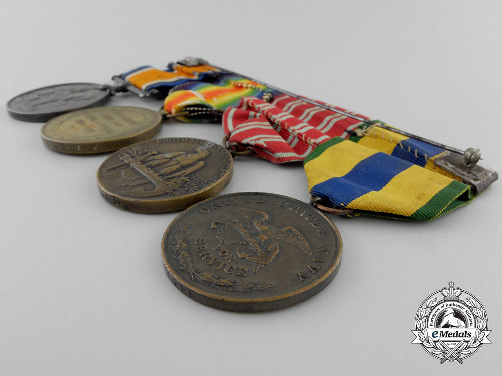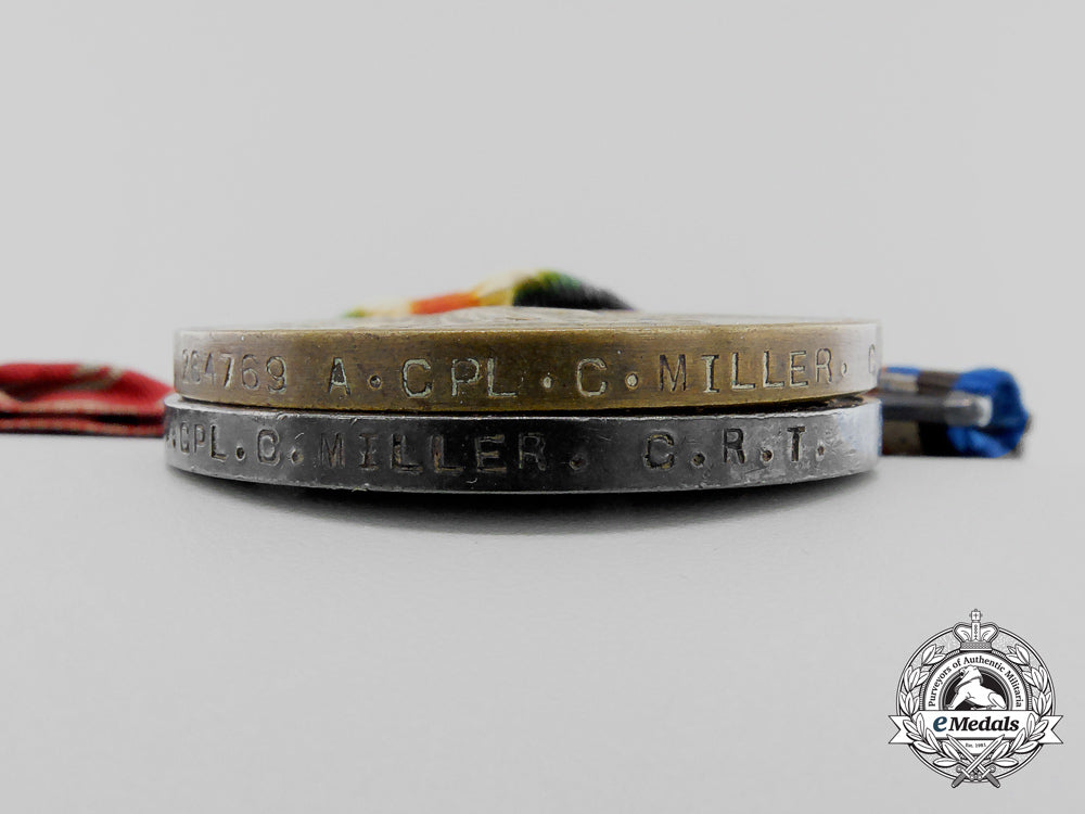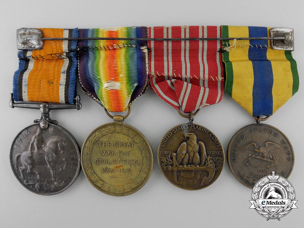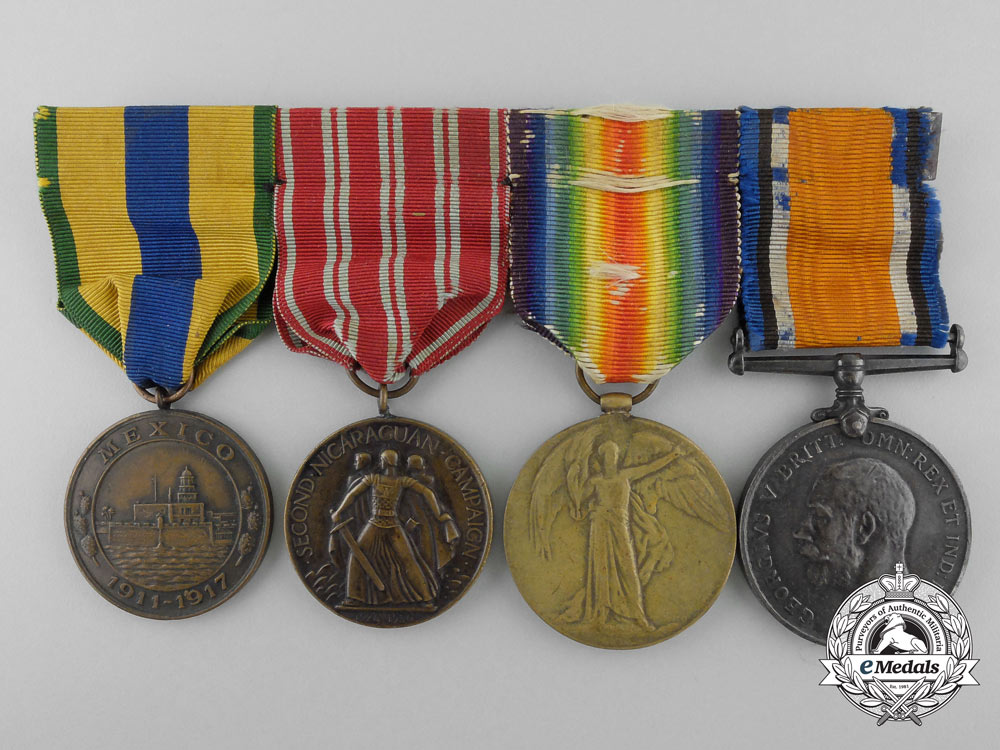 Mexican Service Medal, Navy Issue 1911-1917 (bronze, number impressed "134" on the edge, 33 mm); Second Nicaraguan Campaign Medal, Marine Corps Issue 1926-1930 (bronze, number impressed "M.No. 5791" on the edge, 32.5 mm, medal re-affixed to ring); Victory Medal (264769 A. CPL. C. MILLER. C.R.T.); and British War Medal (264769 A. CPL. C. MILLER. C.R.T.). Mounted to a suspension with swing bar pinback, original ribbons, very dark patina on the BWM, light contact, near extremely fine.