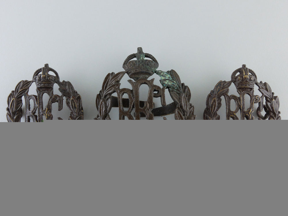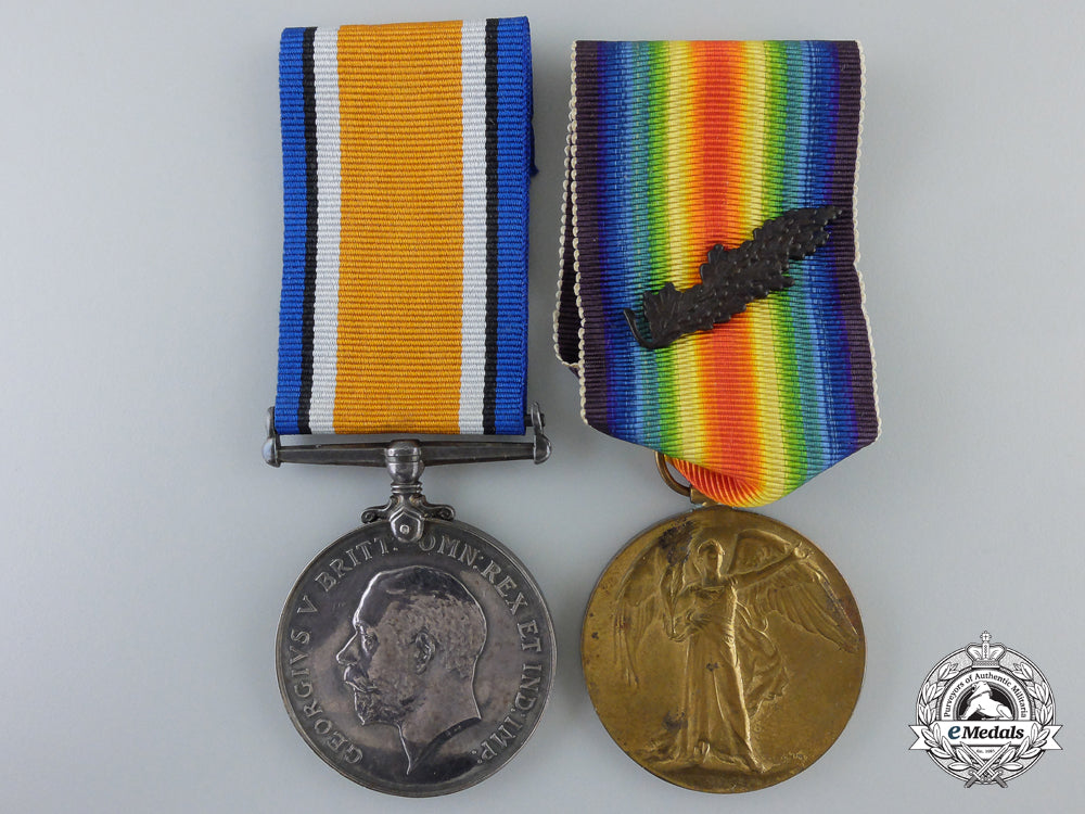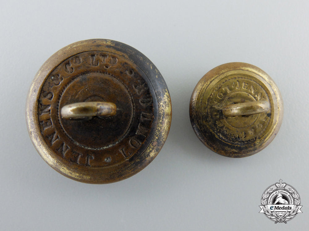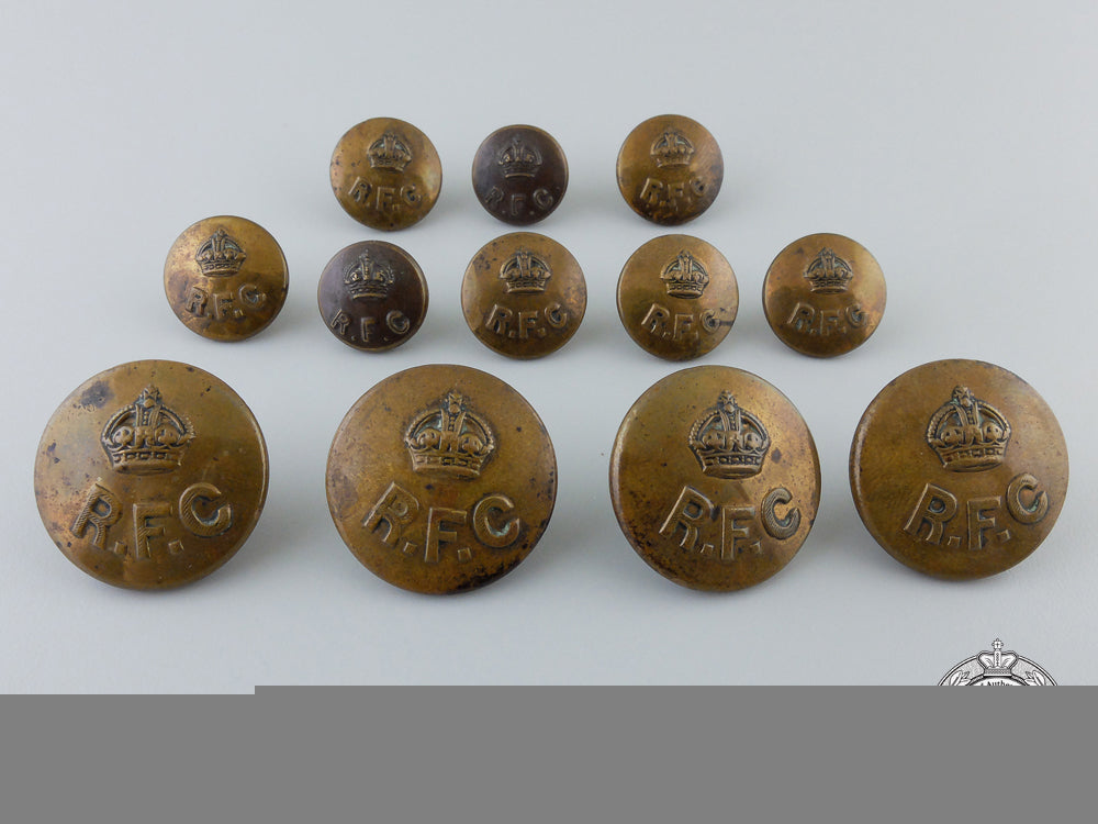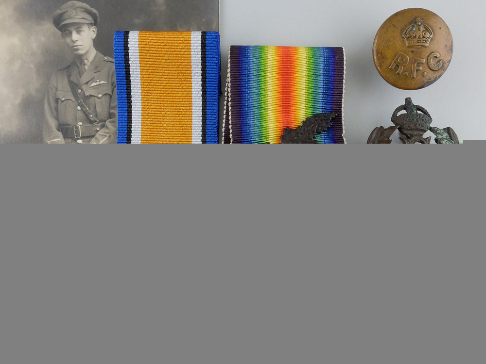 British War Medal and Victory Medal with MID Oak Leaf. Naming has been professionally erased on both medals, as requested by the family prior to sale. Unmounted, dark patina on the BWM, spotting on the VM, very light contact, extremely fine. Accompanied by a Royal Flying Corps Cap Badge (bronze, 36.5 mm x 42 mm, intact prongs); a Royal Flying Corps Collar Tab Pair (bronze, 28.5 mm x 34 mm, intact lugs); four Small Royal Flying Corps Tunic Buttons (bronze, maker marked "JENNENS & Co Ltd LONDON" on their reverses, 16.7 mm each); six Large Royal Flying Corps Tunic Buttons (bronze, maker marked "JENNENS & Co Ltd LONDON" on their reverses, 23.8 mm each); two Royal Flying Corps Shoulder Buttons (bronze, maker marked "J.R. GAUNT & SON Ltd LONDON ENG" on their reverses, 14.5 mm each); a Studio Photograph of Atkins in his Royal Flying Corps Uniform (black and white, inscribed in pencil "2 LT George Carmen Atkins 1917" and marked "CARON, Boulogne-s/Mer" on the reverse, 84 mm x 137 mm, postcard backer); a Photograph of the Atkins Family Grave Marker (with his name, along with that of his wife, Marie's and his son, George's, engraved upon it, 102 mm x 152 mm), along with assorted research papers.