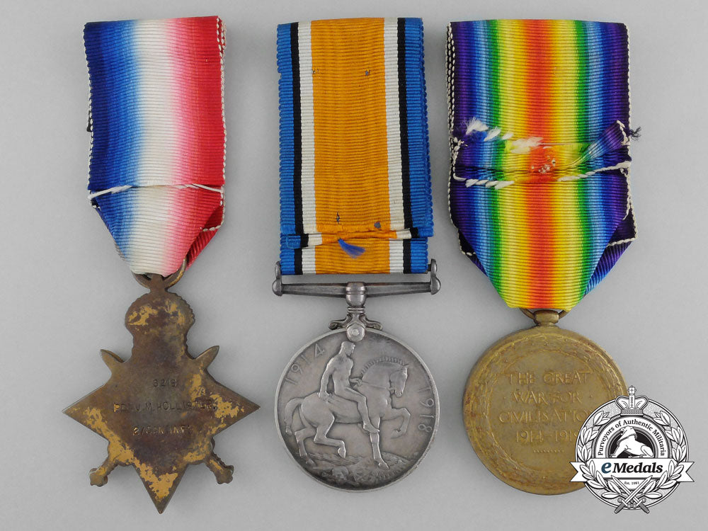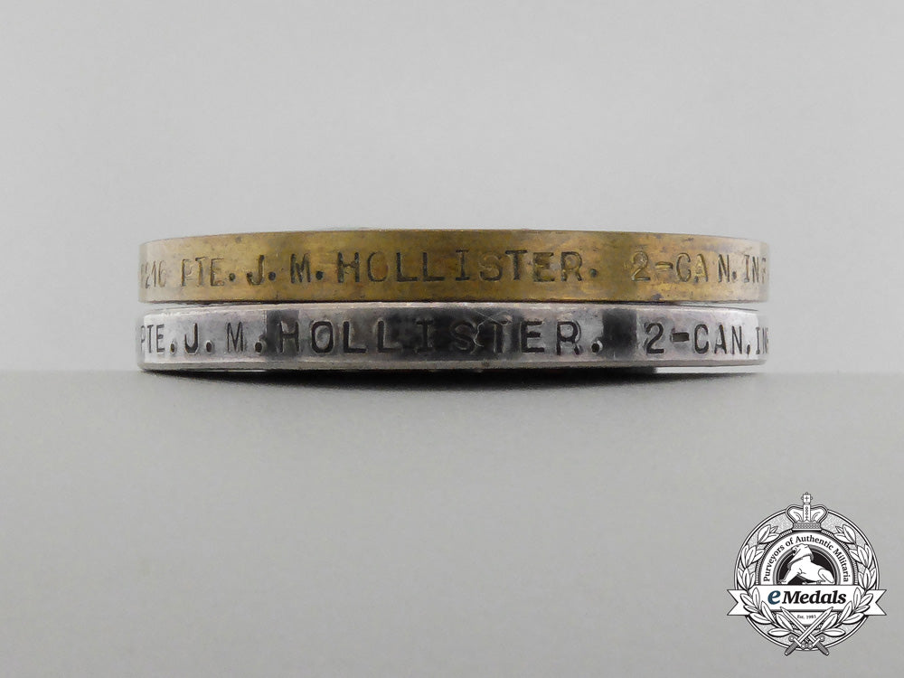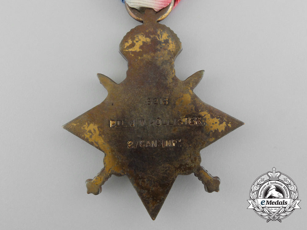 1914-15 Star (8216 Pte J.M. HOLLISTER. 2/CAN:INF:); British War Medal (8216 PTE. J.M. HOLLISTER. 2-CAN.INF.); and Victory Medal (8216 PTE. J.M. HOLLISTER. 2-CAN.INF.). Naming is officially impressed. Un-mounted, replacement ribbons, contact marks and surface wear, very fine.
