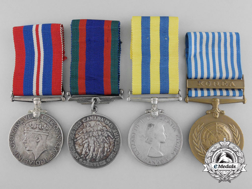 Second World War/Korean War Veteran's Group of Four, Lieutenant Harold R. Osborn, Lincoln and Welland Regiment, PPCLI: Canadian Volunteer Service Medal; War Medal 1939-1945; Korea Medal (ZB 10201 H.R. OSBORN); and United Nations Korea Medal (ZB 10201 H.R. OSBORN). Naming is officially impressed on the KM and impressed on the UNKM, the Second World War pair are un-named. Un-mounted, original ribbons, bruising on the UNKM, light contact, near extremely fine. Accompanied by copies of his Certificate of Service, Attestation Paper, Index Cards, Service Records and assorted research papers.
