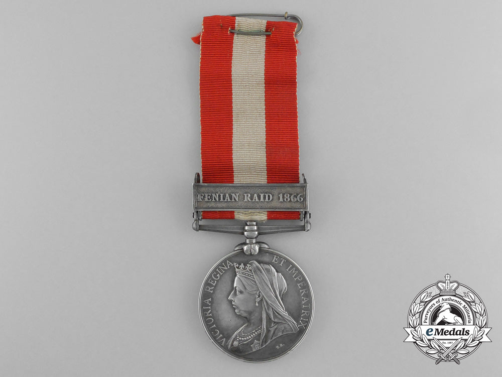 1 Clasp - FENIAN RAID 1866 ( Cpl. J. Farrell, 5 th. R.L.I.). Naming is officially impressed. Original ribbon with pinback, light contact, near extremely fine.