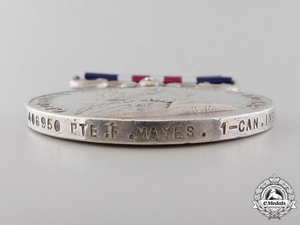 ess in the knee joint. Pain sharp piercing in character originating internal condyle - radiating across knee joint. Weakness of knee after walking. On Aug. 1, 1918. Wounded in right knee with shrapnel consequently invalided to England and the present disability resulting." It was estimated that in eight months, he would recover, but that he could not resume his former occupation as a Fireman, "due to (the) loss of function of (his) right knee." Following his discharge from hospital, he was taken on strength at CDD Buxton on September 12, 1919 but just couldn't behave himself, as he was awarded 28 days Detention on October 20, 1919, for being AWOL from September 8 to 9 in England, breaking arrest and remaining absent from October 17 to 19, before he returned to Canada on October 22 aboard the S.S. Royal George. He was taken on strength at No. 1 District Depot in London, Ontario and posted to the Casualty Company on November 5th. In his Medical History of an Invalid, dated November 6, 1919 at London, it documents his two battle incurred injuries. First, the shell explosion while in France in June 1916, where he suffered a broken nose, his condition stated as "Nose depressed in centre and bridge considerably widened, causing deformity", with his disability listed as "permanent". The second, the shrapnel wound in France to his right knee on August 10, 1918 while in France, noting the swelling to his right knee, making it noticeably larger than his left knee, with "Movements of knee joint normal tho' painful on extension of flexion", with one to two months rehabilitation estimated. It also describes in detail his two injuries: "On June 13th 1916 was blown by shell explosion up against the side of (a) dugout, and nose was badly fractured. Was not admitted to hospital. On Aug. 11th 1918 was wounded in right knee by shrapnel. Operated on at Rouen to remove foreign body about 14-8-18. rejoined Unit about Sept. 15th, 18. On Dec. 18th, 18 went sick with knee paining and swollen. Invalided to England Feb. 16, 19. Invalided to Canada Oct. 20th. 1919.", as well as two other hospitalizations: "Was gassed at Telegraph Hill in April, whilst on leave in 1916, fainted in street and was admitted to hospital for 5 weeks. Good recovery. Had bronchitis in June 1915, in hospital 8 days. Good recovery." He is documented as "to be discharged in Canada for Misconduct Under KR&O 392 Sec. XI" but his Discharge Certificate states that he was discharged upon demobilization as "Medically unfit for general service" at No. 1 District Depot in London, Ontario on November 8th. He stated that his proposed residence after discharge was Hornell, New York, his address later changed to Toronto, Ontario. In addition to his Military Medal, he was awarded the 1914-15 Star and the British War Medal, and was entitled to wear a War Service Badge, Class "A". However, his conduct during the Great War necessitated that he return his original Military Medal, 1914-15 Star and British War Medal, as requested by the government, and were so received by them on May 26, 1941. The medal offered here, is very likely one that Mayes had engraved privately afterwards for wear.