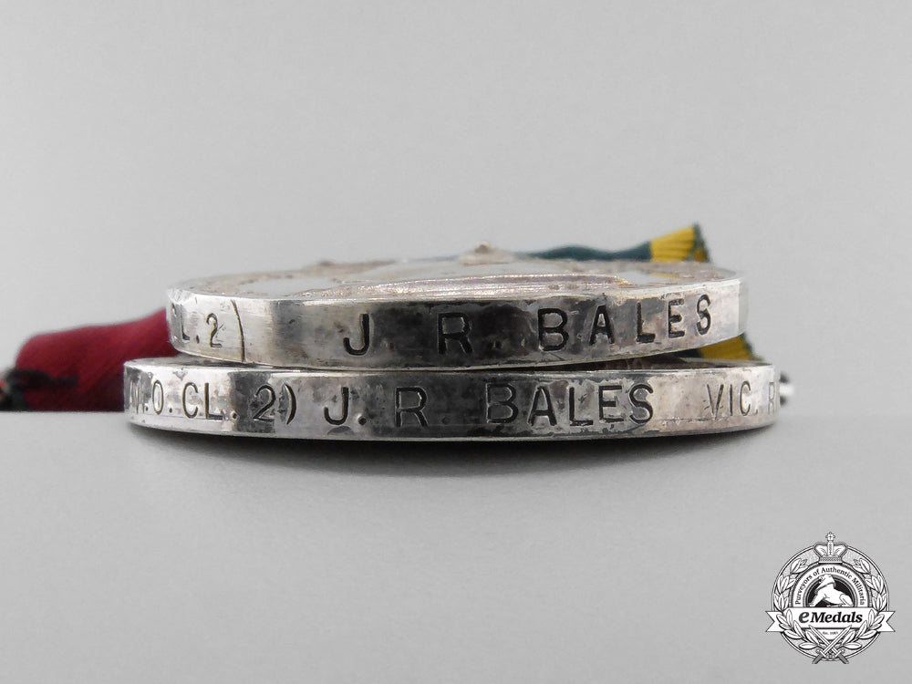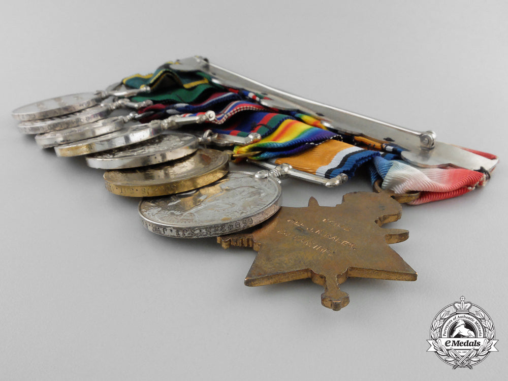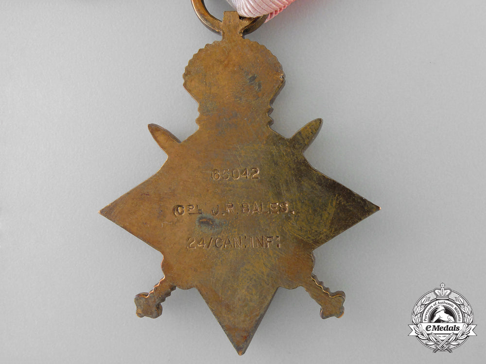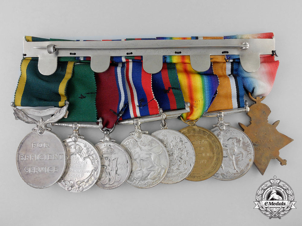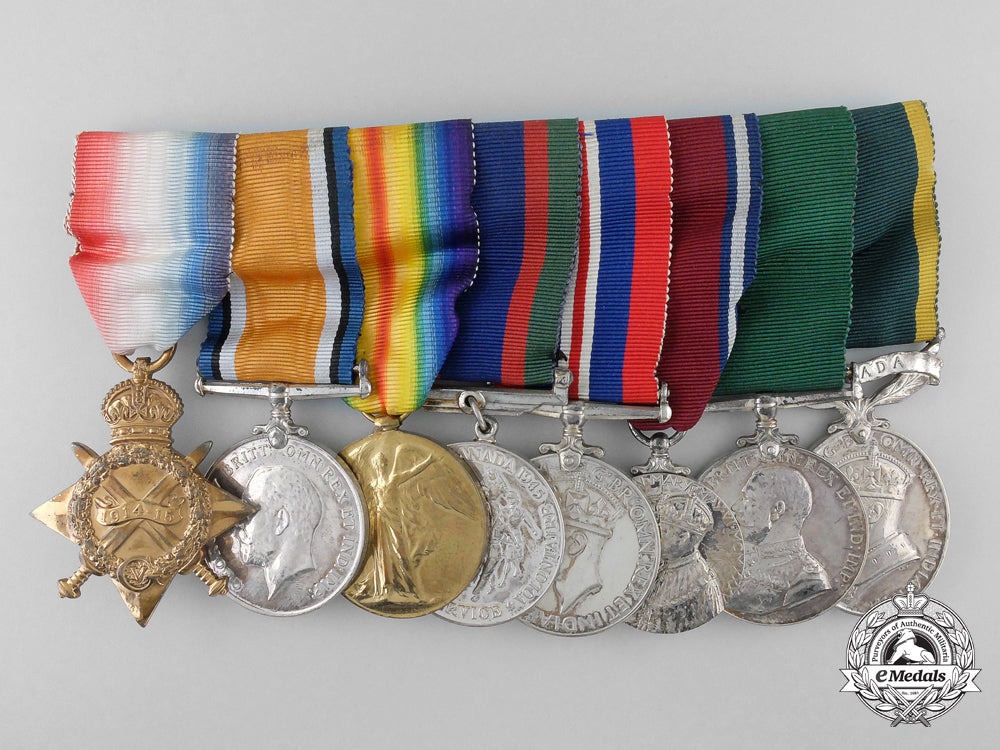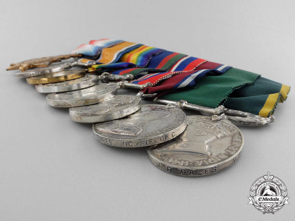 1914-15 Star (65042 Cpl J.R. BALES. 24/Can:Inf:); British War Medal (65042 S. SJT. J.R. BALES. 24-CAN.INF.); Victory Medal (65042 S. SJT. J.R. BALES. 24-CAN.INF.); Canadian Volunteer Service Medal; War Medal 1939-1945; Jubilee Medal 1935; Colonial Auxiliary Forces Long Service Medal, GVR (R.Q.M.S. (W.O. CL. 2) J.R. BALES VIC. RIF. OF C.); and Efficiency Medal, GVIR, 1st Issue with CANADA Scroll (R.Q.M.S. (W.O. CL. 2) J.R. BALES V.R. OF C.). Mounted to a suspension with swing bar pinback, as worn by the veteran, original ribbons, light contact, better than very fine. Accompanied by copies of his West Derby Entry of Birth Certificate, Index Cards, Attestation Papers, Service Records, WWII Certificate of Active Service in Canada, Discharge Certificates, Supplement to the Canada Gazette (awarding him the Jubilee Medal 1935, page 3, dated May 4, 1935), Canada Gazette (awarding him the Colonial Auxiliary Forces Long Service Medal, page 1837, dated January 10, 1931), Canada Gazette (awarding him the Efficiency Medal with CANADA Scroll, page 1411, dated April 3, 1943), along with two WWI Scanned Group Photographs (one entitled "Sergeants, 24th Battalion (Victoria Rifles) C.E.F.", the other entitled "No. 8 Platoon"), all in plastic sleeves housed in a binder.