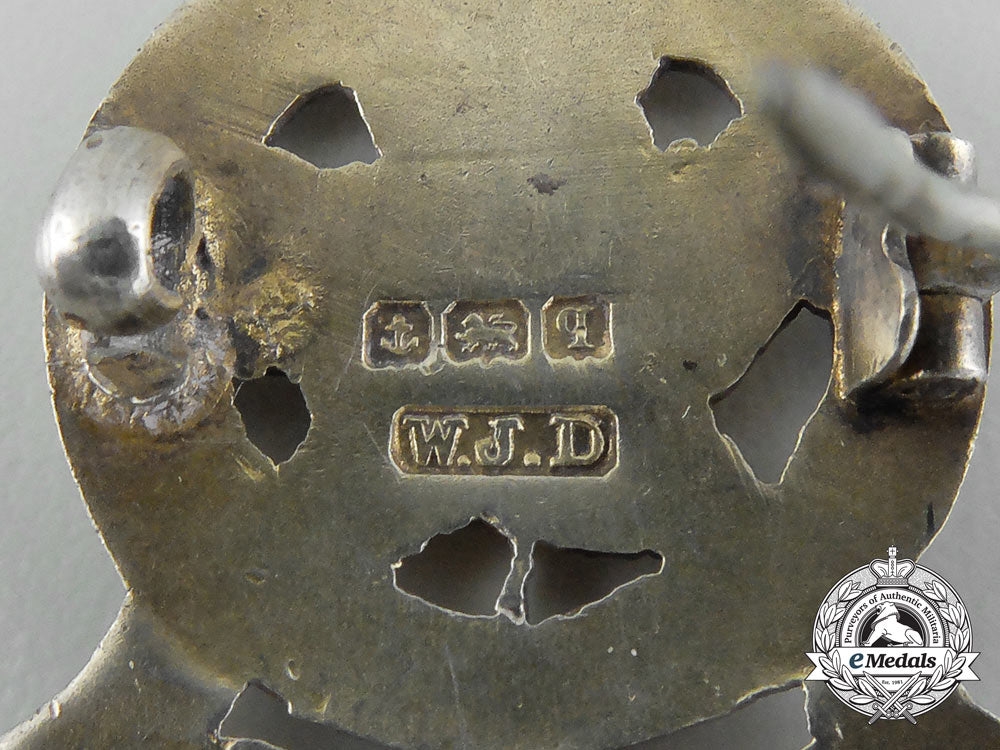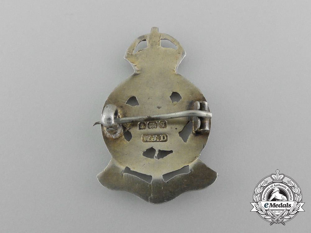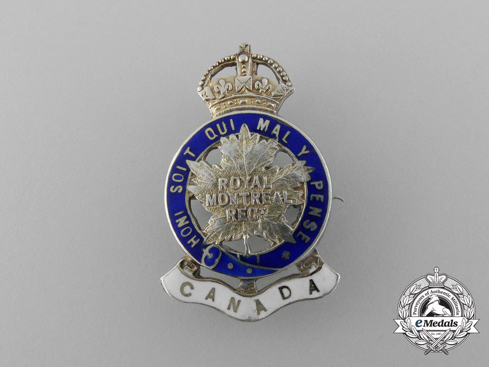 Royal Montreal Regiment: Sterling silver with white and blue enamels, marked with an anchor (made in Birmingham), the British lion, date marked "q" (1915) and maker marked "W.J.D" on the reverse, 21.5 mm x 34 mm, horizontal pinback, chipping evident in the white enamels, crazing present in the blue enamels, very fine.