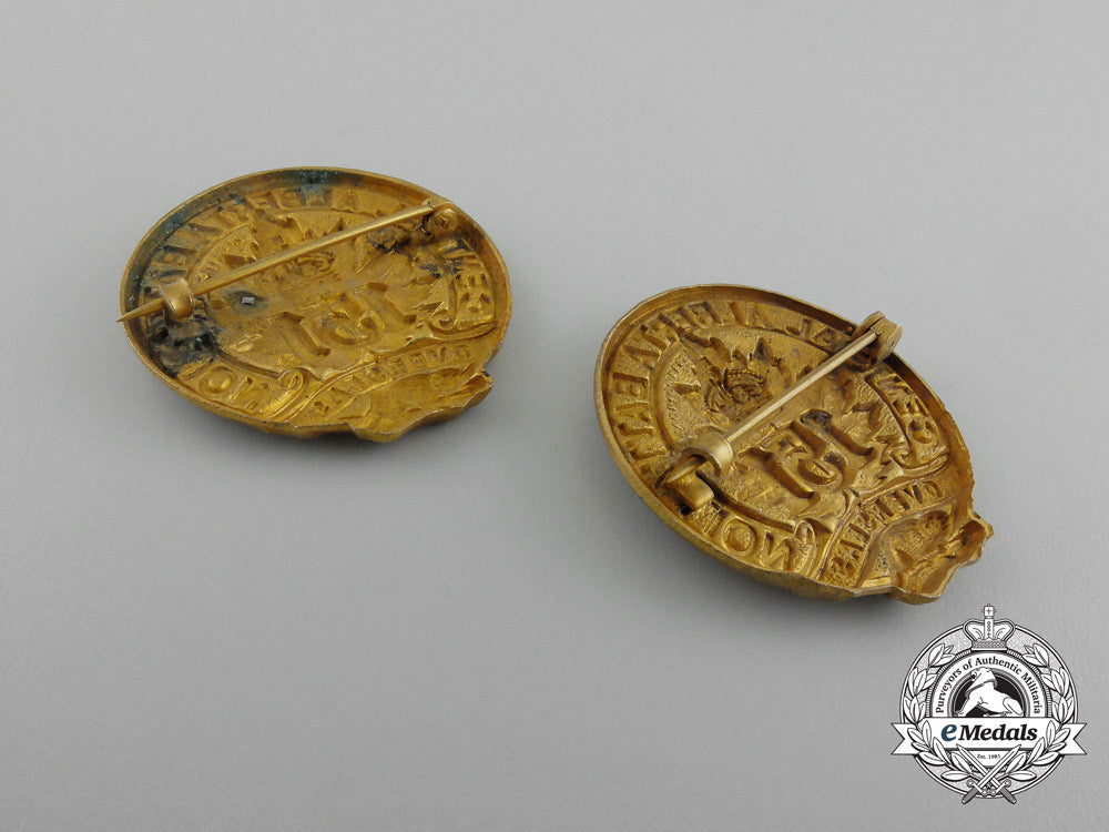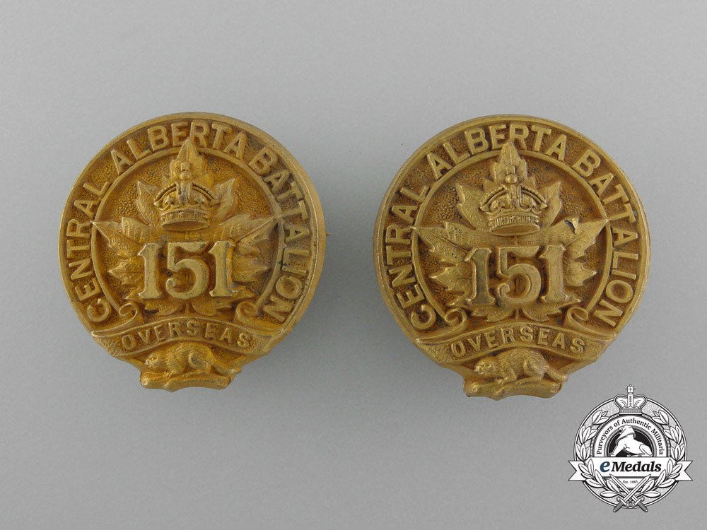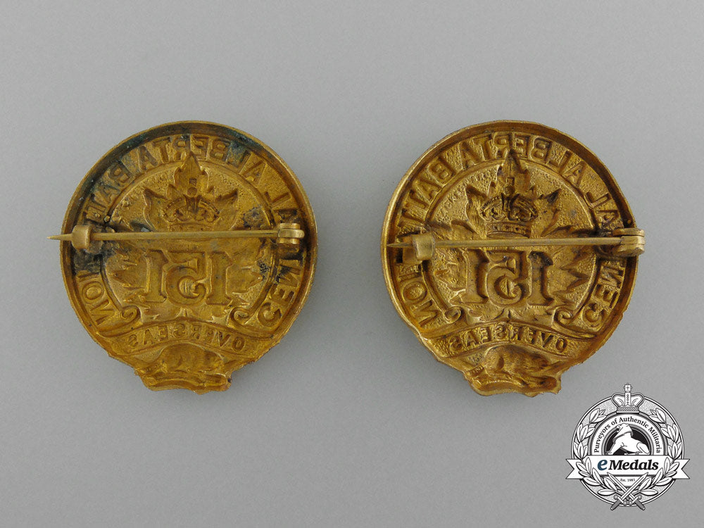 151st Central Alberta Battalion: 2nd version (with "Battalion" substituted for "Canada"). Gilt on copper, maker marked "JACKSON BROS" on the reverse, 31.7 mm x 32.2 mm each, horizontal pinback, extremely fine.