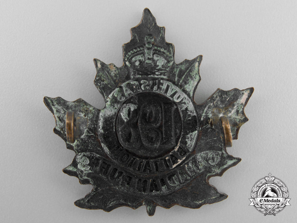 Footnote: The Battalion was raised and mobilized in Toronto, Ontario under the authority of G.O. 69, July 15, 1916. The Battalion sailed March 28, 1917 under the command of Lieutenant-Colonel J.A. Cooper with a strength of 31 officers and 841 other ranks. In England, the Battalion was absorbed into the 3rd Reserve Battalion. It was disbanded on September 15, 1920.