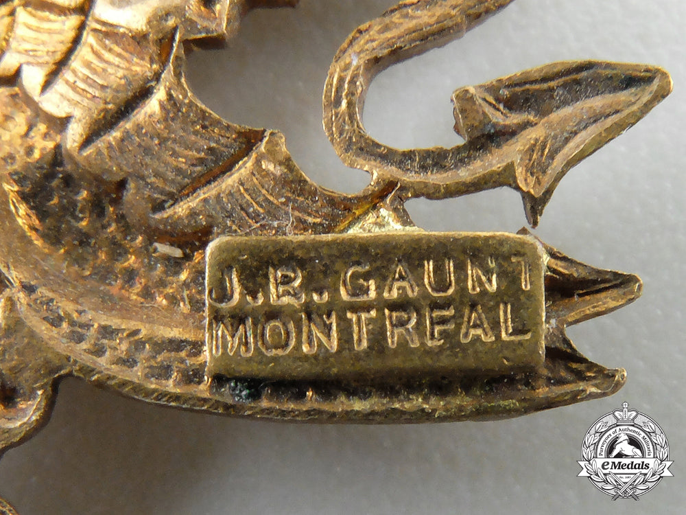 Cap Badge: brass gilt, maker marked "P.W. ELLIS & CO. 1916" on the reverse, 43.7 mm x 53.5 mm, one of two lugs intact; and Collar Tab Pair: brass gilt, maker marked "J.R. GAUNT MONTREAL" on their reverses, 30 mm x 36.5 mm each, intact lugs. Near extremely fine.
