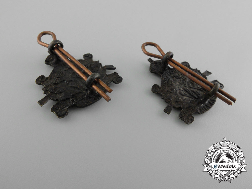 Edmonton Sportsmen's Battalion: Pickled copper, unmarked, 29 mm x 29.5 mm each, intact lugs and pins, extremely fine.