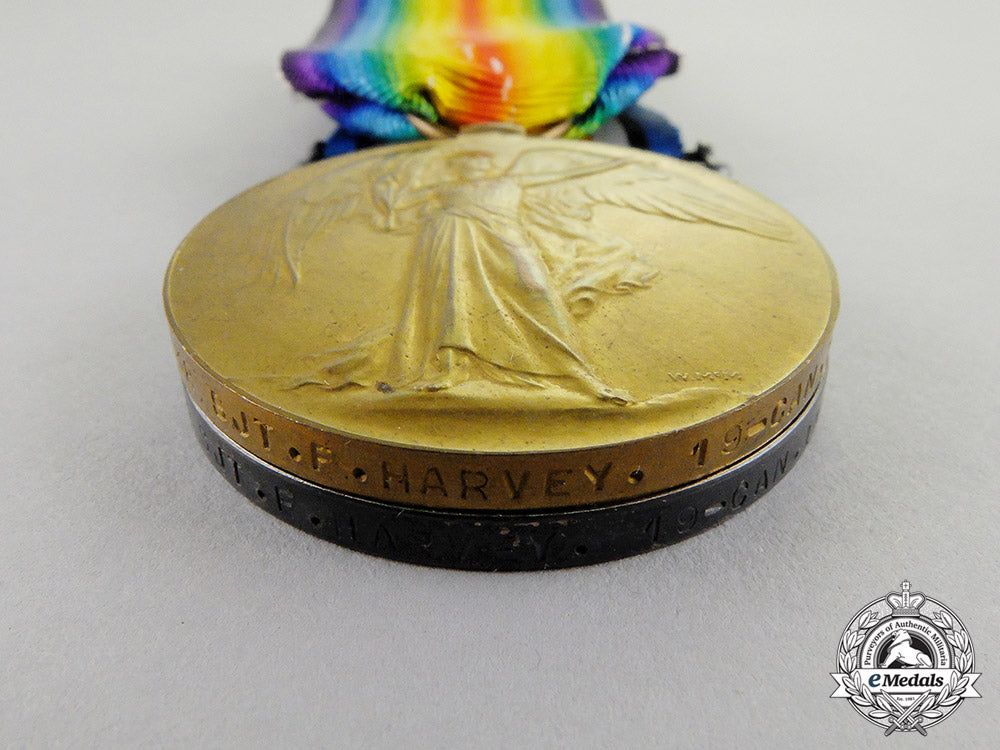 Canada; 1914-15 Star (55438 Pte F. HARVEY. 19/CAN:INF:). British War Medal (55438 SJT. F. HARVEY. 19-CAN.INF.); and Victory Medal (55438 SJT. F. HARVEY. 19-CAN.INF.). Naming is officially impressed. Unmounted, the Star with an original ribbon, the BWM and VM with replacement ribbons, very dark patina on the BWM, residue in the recessed areas of the Star from cleaning, light contact, better than very fine. Accompanied by two cardboard lids from medal shipping boxes, both addressed "55438 SJT. F. HARVEY, 19-Can.Inf.".