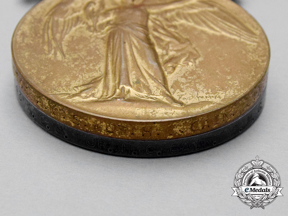 British War Medal (65143 A.C.S. MJR. H.C. CAIN. C.M.G. BDE.); and Victory Medal (65143 A.C.S. MJR. H.C. CAIN. C.M.G. BDE.). Naming is officially impressed. Un-mounted, replacement ribbons, very dark patina on the BWM, gilt wear on the VM, light contact, better than very fine. Accompanied by a CEF For Service At The Front Badge (bronze with red, white and blue enamels, numbered "399129" on the reverse, 22.5 mm, screwback); a Canada Shoulder Title (bronze, unmarked, 11.3 mm x 53.8 mm, intact lugs and pin, undulated); and a Photograph of Cain (black and white, gloss finish, Toronto studio stamped on the reverse, 35 mm x 35 mm, creased).