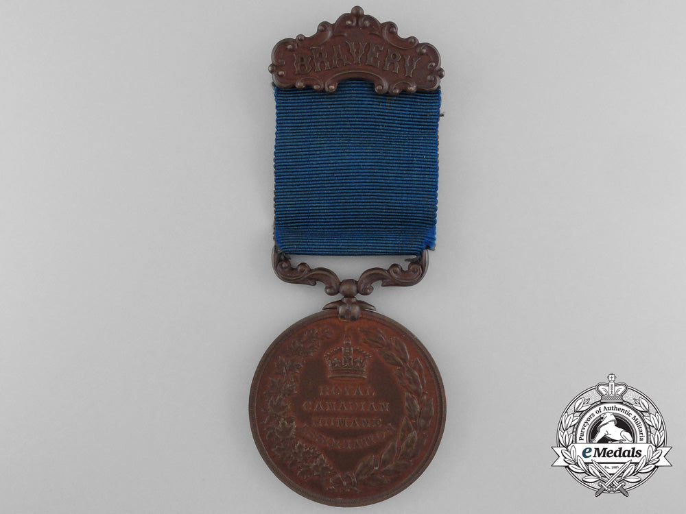 Bronze, obverse illustrating the Royal crown above the inscription "ROYAL CANADIAN HUMANE ASSOCIATION", framed by an open-ended wreath composed of maple leaves at the left and laurel leaves at the right, reverse engraved "AWARDED TO Alvin E. Luck for rescue of MARY J. RYAN from drowning, Barrie - July 1920 -", 48 mm, ornate suspension, original ribbon, pinback hanger inscribed "BRAVERY", extremely fine.