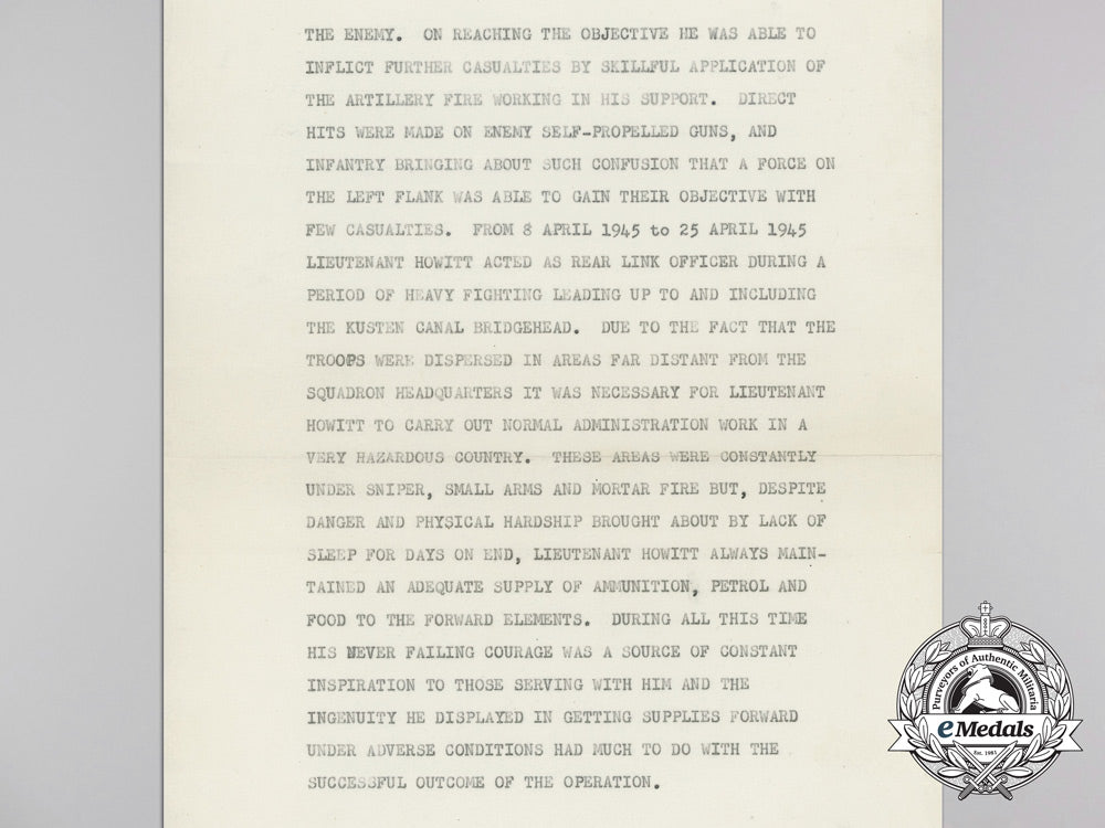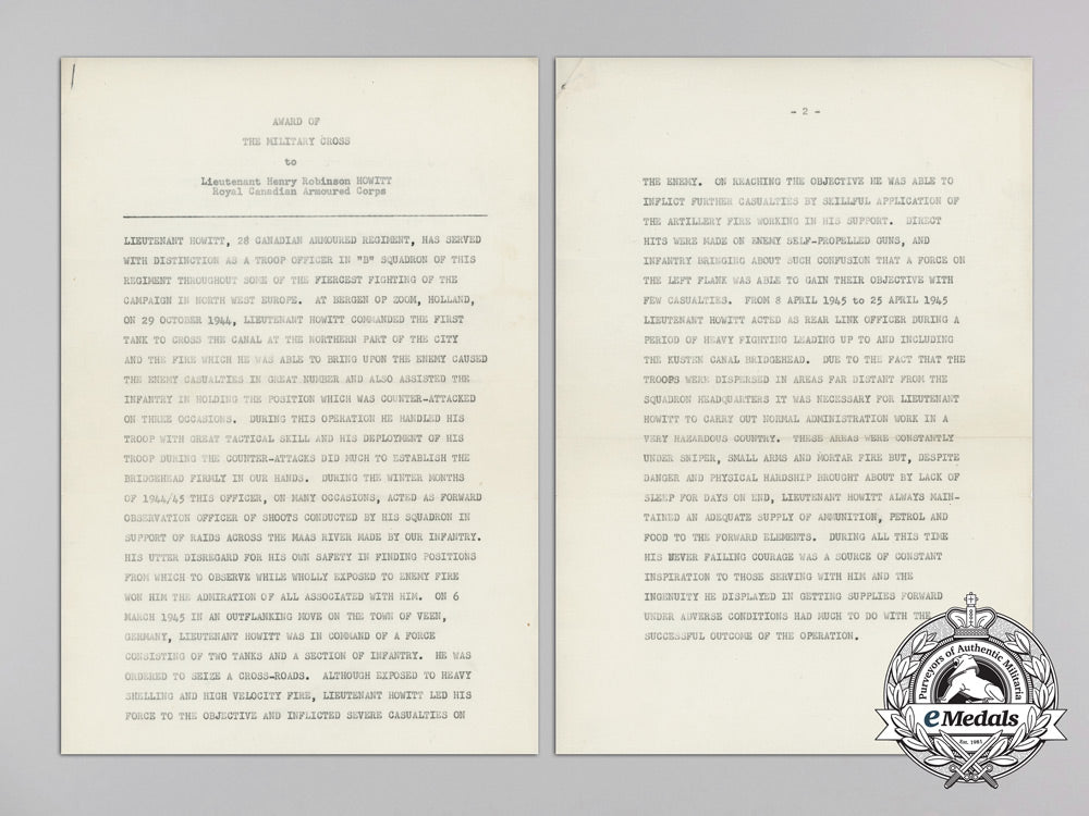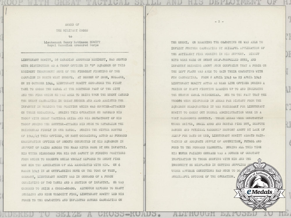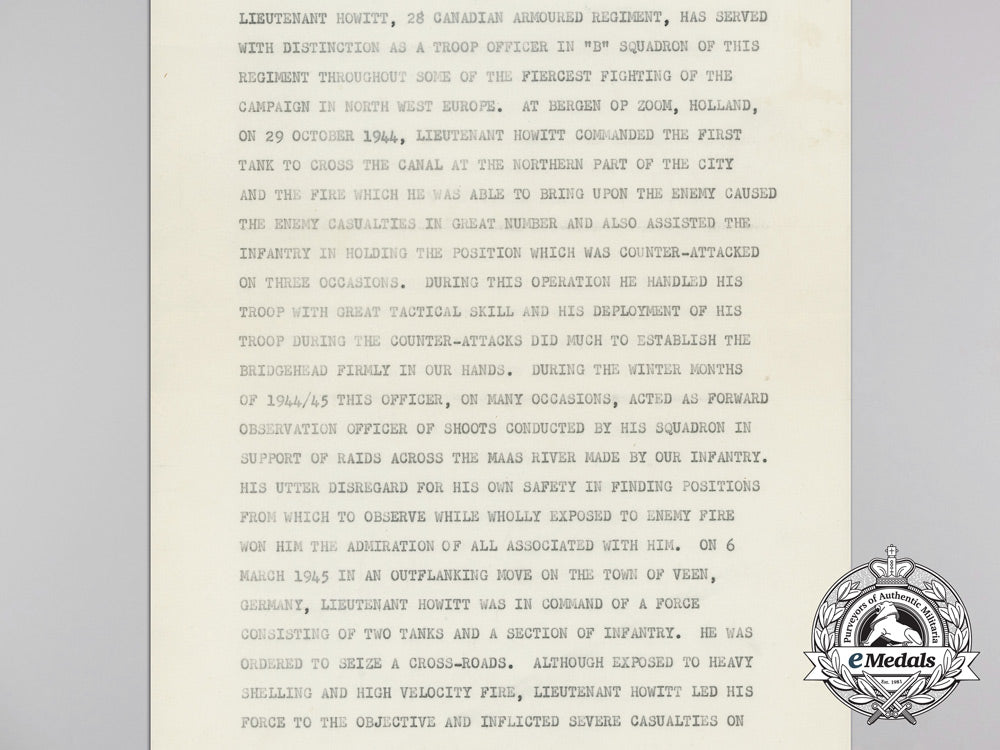 A Second War Military Cross Citation To Lt. Howitt 28Th Canadian Armoured Regiment