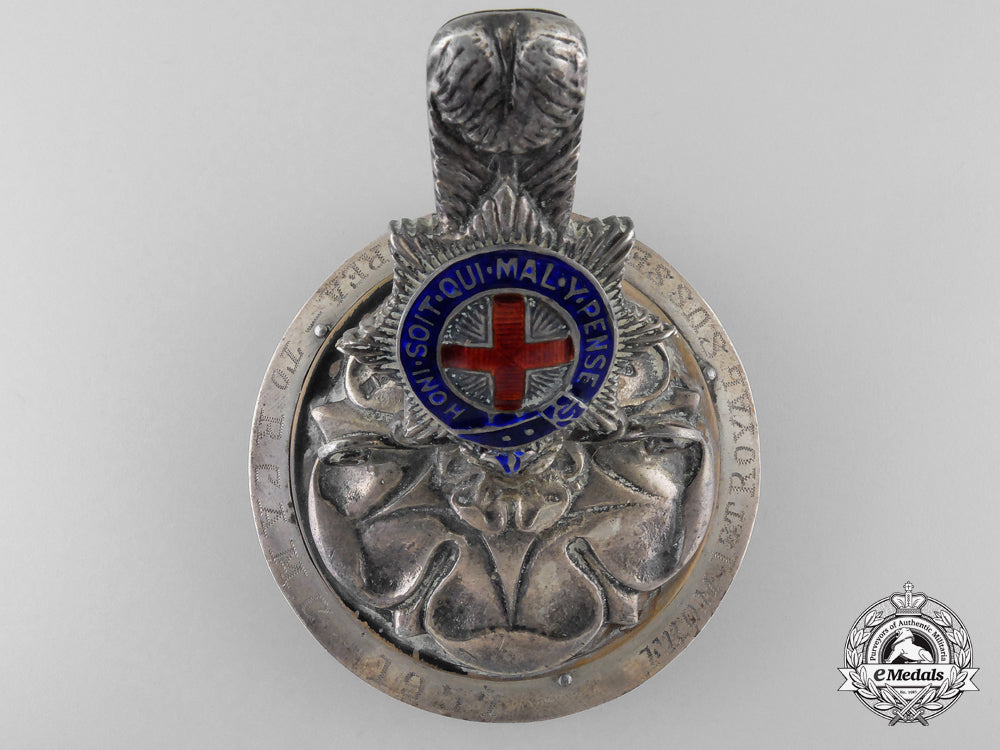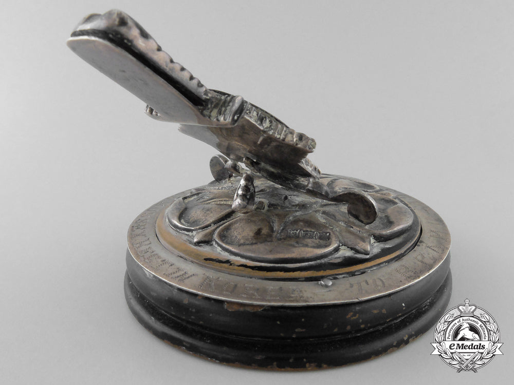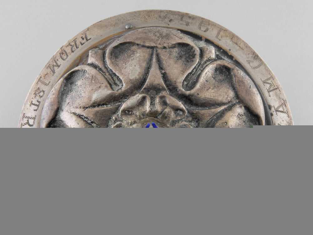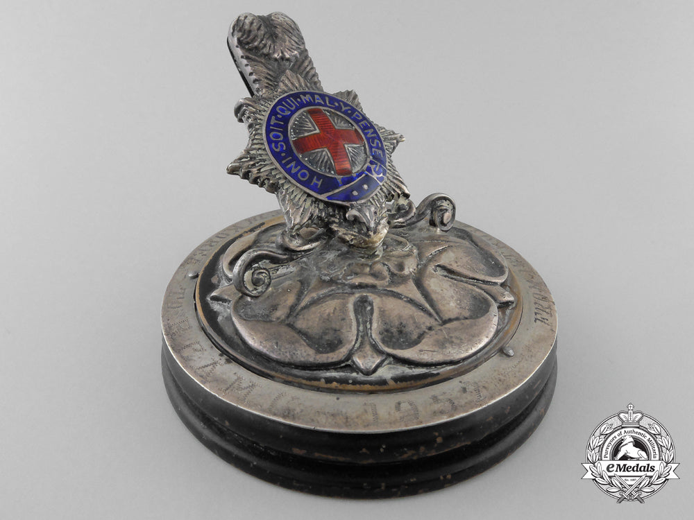 Silver with red and blue enamelled Royal Sussex Regiment insignia measuring 36.3 mm x 51.5 mm, the insignia raised upon a silver base incorporating a royal house rose design, hallmarked with the British lion, an anchor (made in Birmingham) and date marked "G" (1956) on one of the rose petals, engraved "FROM 1ST ROYAL SUSSEX REGT IN KOREA - TO R.C.A.M.C. - 1957" on the sterling silver ring surrounding the rose, the ring held in place via three pins, mounted to a 70.5 mm black-painted wooden base, green felt bottom, 47 mm in height, intact enamels on the insignia, bent and broken support on the reverse of the insignia, scattered chips and wear in the black paint on the base, the felt on the bottom peeling back, light contact, better than very fine. (C:45)