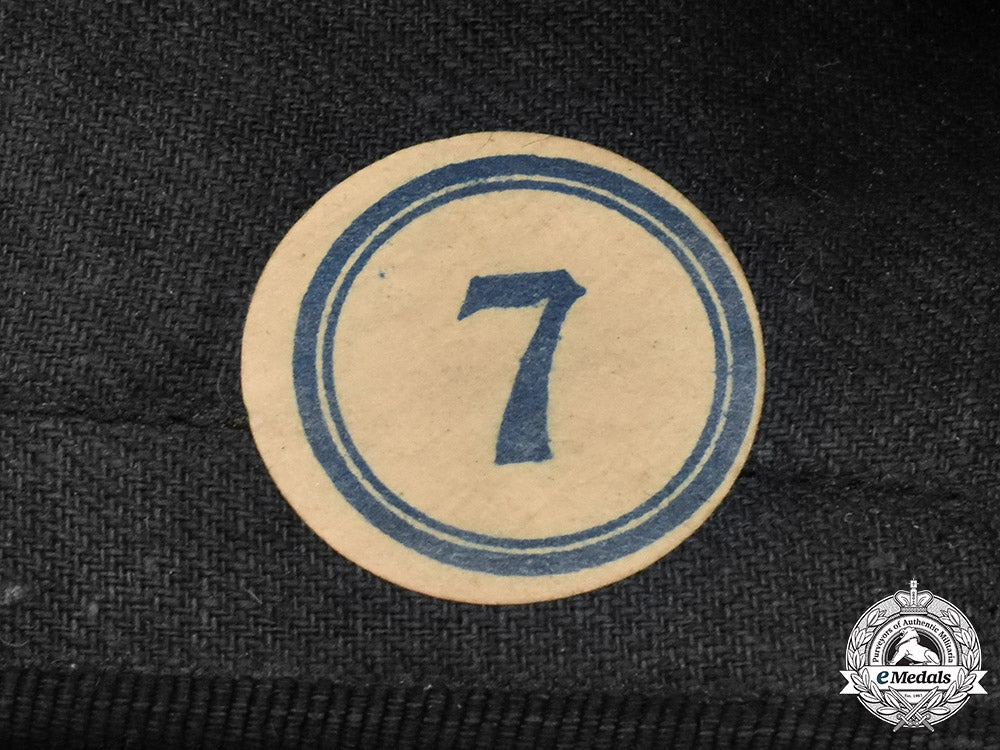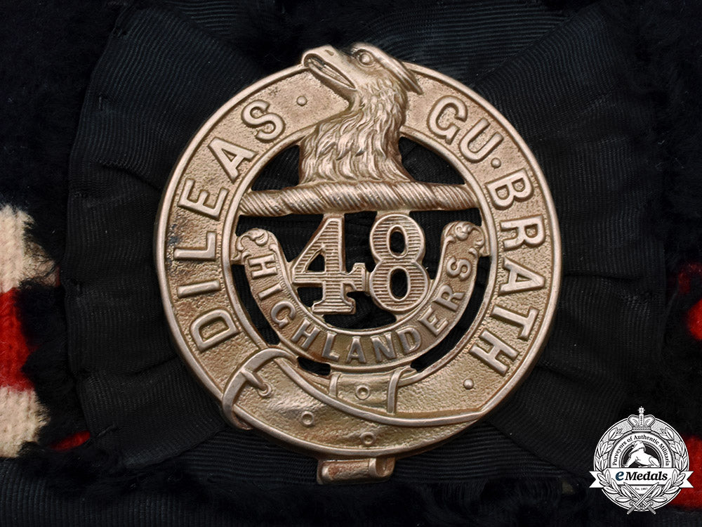Finely textured, black wool upper, bordered by a red, white and black checkered pattern in the wool which encompasses it, with a 14 mm wide black rayon border along the open end, a 53.5 mm (w) x 57.7 mm (h) 48th Highlanders Glengarry Badge in white metal, surmounting a black rosette on the left side, the rosette designed with frayed edges on all four sides, the badge held in place via intact lugs and pin, topped by a red toorie, dual black rayon ribbons at the rear, inside is lined in black cotton, circular label printed in blue ink and marked size "7" at the right rear, the cap measuring 295 mm (w) x 102 mm (h). It is free of mothing and very clean, with intact stitching. Extremely fine.
