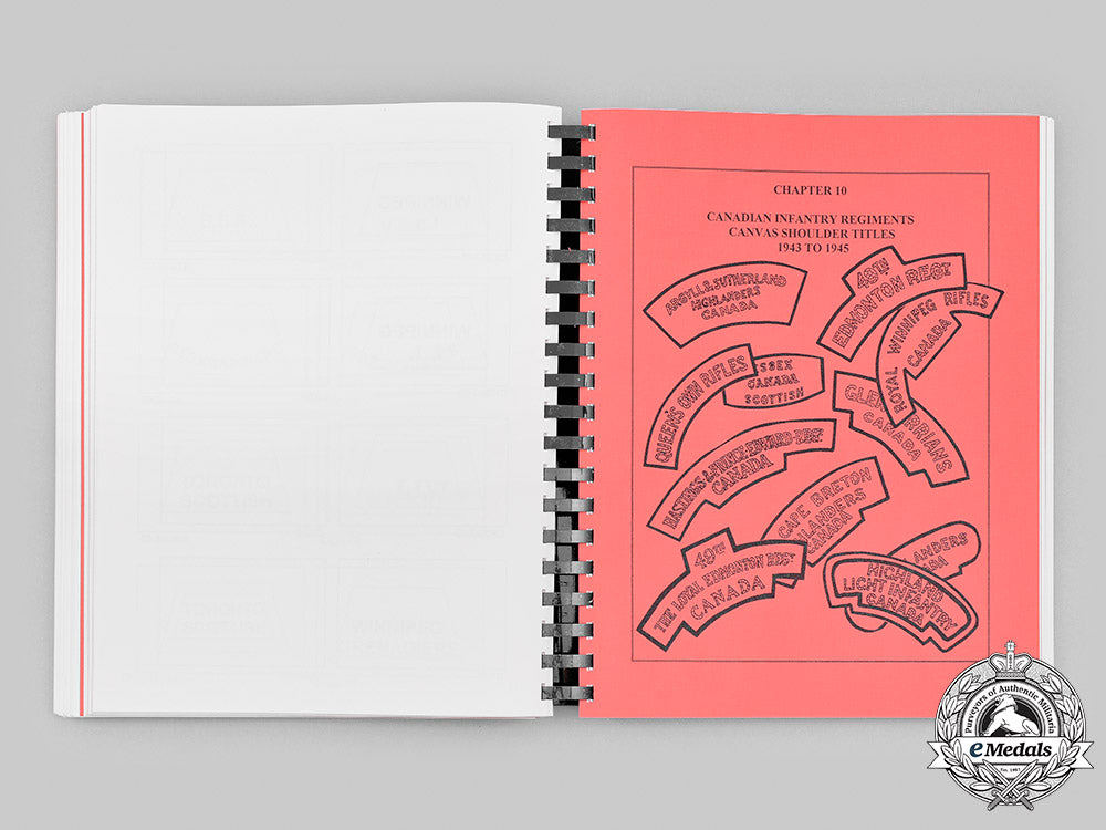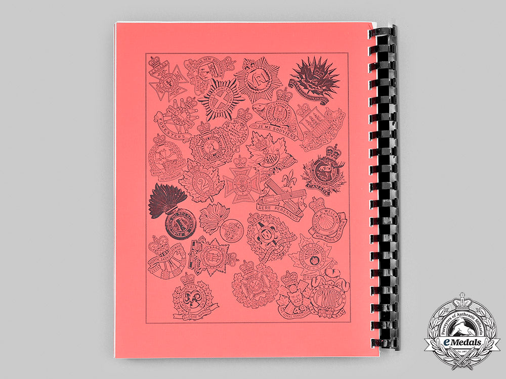 Softcover, entitled "A Catalogue of Twentieth-Century Canadian Military Cloth and Metal Shoulder Titles 1900 to 1999, Part III: Royal Canadian Infantry Corps", thoroughly researched and written by William C. Hampson, CD, BA, MEd of Calgary, Alberta, self-published and printed in Canada, ISBN-0-9685714-2-5. It contains seventeen chapters: I - Canadian Infantry Schools of Military Instruction & Affiliated Insignia 1900-1987; II - Roll of the Royal Canadian Infantry Corps 1895-1999; III - Canadian Infantry Regiments 1900 to 1914; IV - Metal Shoulder Titles 1900-1914; V - Canadian Militia Districts of Canada & Canadian Infantry Battalions, Canadian Expeditionary Force 1914 to 1920; VI - Cloth & Metal Shoulder Titles of Canadian Infantry Battalions, Canadian Expeditionary Force 1914-1920; VII - Canadian Militia Districts of Canada and Canadian Infantry Regiments 1930 to 1939; VIII - Canadian Infantry Formations 1939 to 1945; IX - Canadian Infantry Regiments Khaki Slipon's 1939-1943; X - Canadian Infantry Regiments Canvas Shoulder Titles 1943 to 1945; XI - Canadian Infantry Regiments Metal Shoulder Titles 1946 to 1965; XII - Canadian Infantry Regiments Cloth Shoulder Titles 1946 to Unification; XIII - Canadian Infantry Regiments 1950 to 1972; XIV - Canadian Infantry Regiments 1992; XV - Canadian Armed Forces Infantry Branch Embroidered Edge Shoulder Titles; XVI - Canadian Armed Forces Infantry Branch Metal Shoulder Titles 1996; XVII - Canadian Armed Forces Infantry Branch Combat Shoulder Titles 1996 to 1999. The catalogue concludes with a Reference Index by Era 1900 to 1999. It contains 676 pages and is loaded with multiple line illustrations of both cloth and metal shoulder titles, along with full lists of every infantry unit that has participated for Canada from 1900 to 1999. The text and illustrations are printed in black ink on a white paper stock, the dividers and covers on a red paper stock, clear plastic front and back protective covers, black plastic spiral-bound, measuring 216 mm (w) x 280 mm (h) x 35 mm (d). Extremely fine.
