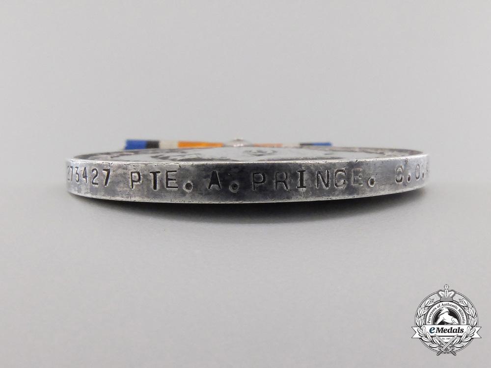 WWI War Medal - Central Ontario Regiment - (273427 PTE. A. PRINCE. C.O.R.). Naming is officially impressed. Very crisp detail, cleaned, light contact, very fine. Footnote: Arthur Prince was born on October 29, 1880 in Lancashire, England. He signed his Attestation Paper with the 216th Infantry Battalion "Toronto Bantams" in Toronto, Ontario, stating that he had no previous military service, that he was married and that his trade was that of Shell Box Maker. The Battalion was raised in Toronto, Ontario under the authority of G.O. 69, July 15, 1916 and sailed April 18, 1917 under the command of Lieutenant-Colonel F.L. Burton with a strength of 36 officers and 783 other ranks. In England, the Battalion was absorbed into the 3rd Reserve Battalion.