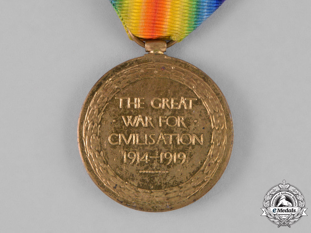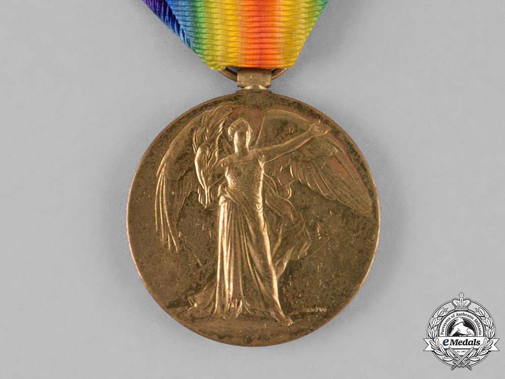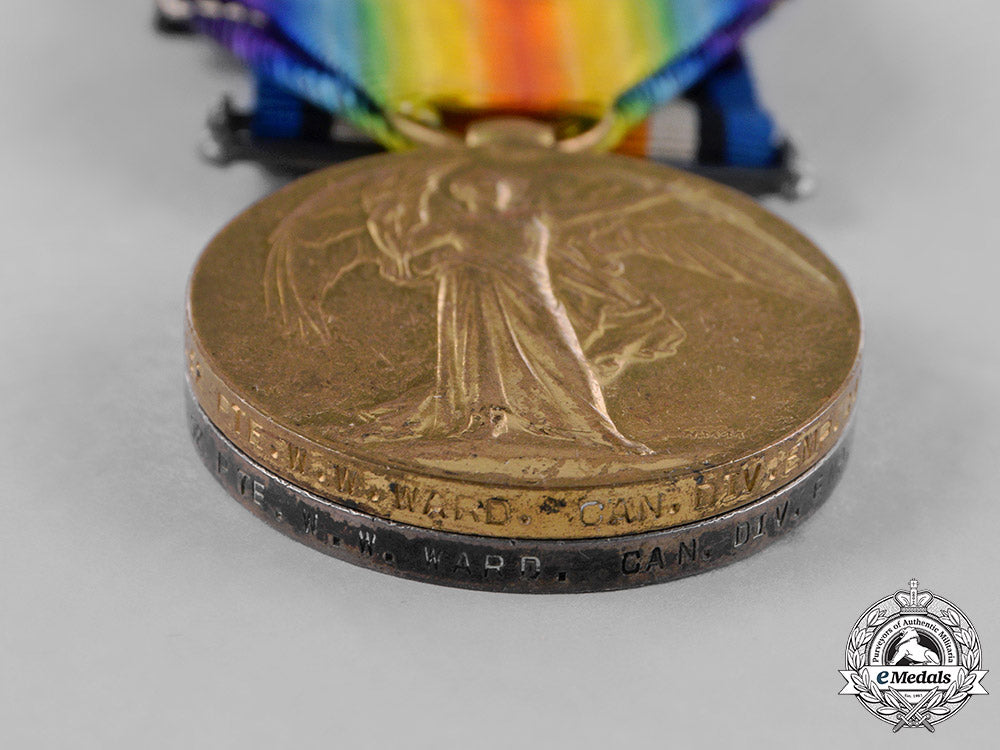 British War Medal (902052 PTE. W.W. WARD. CAN. DIV. EMP. COY.); and Victory Medal (902052 PTE. W.W. WARD. CAN. DIV. EMP. COY.). Naming is officially impressed. Un-mounted, dark patina on the BWM, edge nicks, contact marks, original ribbons, very fine.