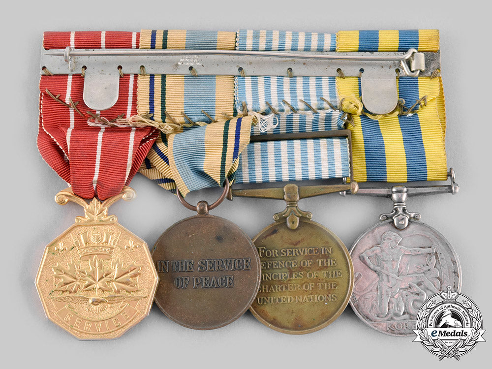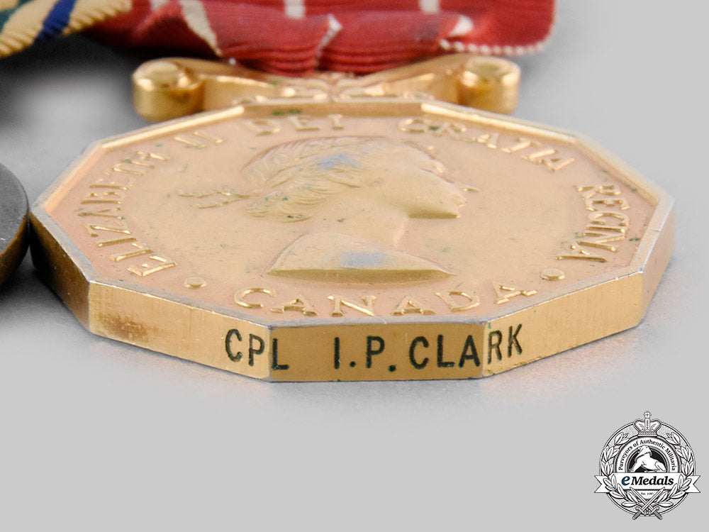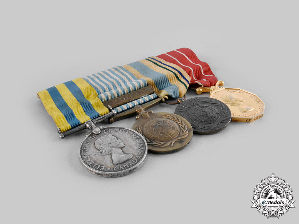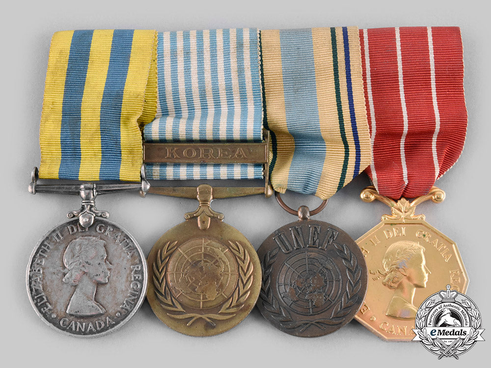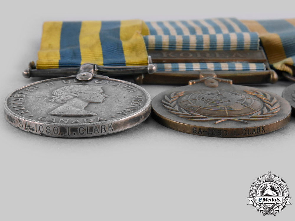 Korea Medal (SA-1080 I. CLARK); United Nations Service Medal for Korea (SA-1080 I. CLARK); United Nations Emergency Force Medal (Israel and Egypt 1956-1957); and Canadian Forces' Decoration, ER II (CPL I.P. CLARK). Naming is mechanical engraved on the KM and UNSMK, engraved on the CFD, the UNEFM is un-named as issued. Mounted to a suspension with swing bar pinback, as worn by the veteran, edge nicks, contact marks, spotting on the two bronze medals, original ribbons, better than fine. Accompanied by copies of his Service Records covering the period 1957 to 1970 and minus the records for the Korean War.