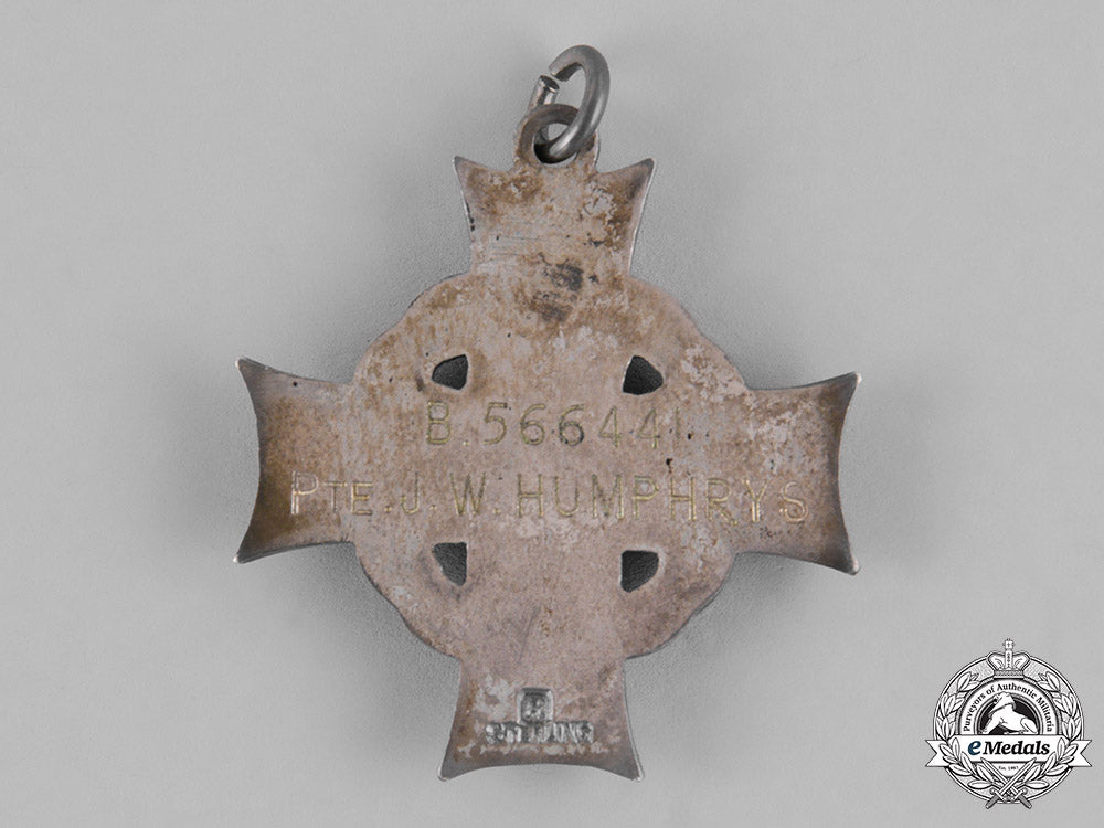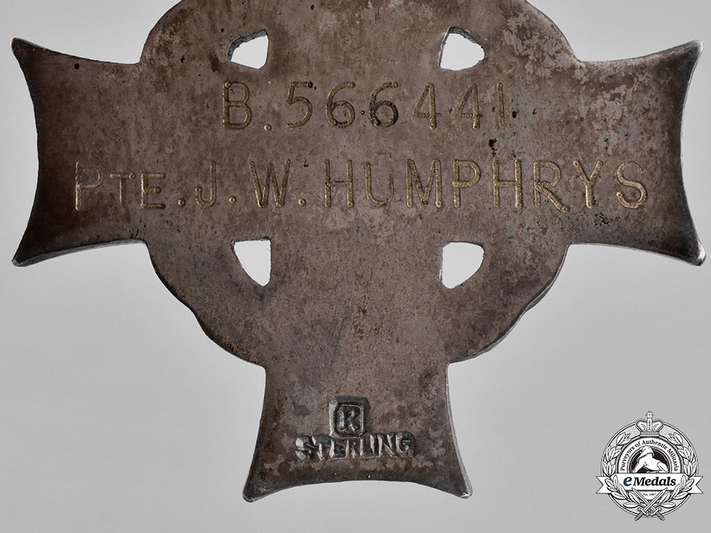Canada; George VI (B.566441 Pte. J.W HUMPHRYS). Naming is engraved. Sterling silver, marked “R” "STERLING" on reverse, surface wear on 6 o’clock arm of cross, along with a partial original neck ribbon, frayed at one end. Near very fine condition.