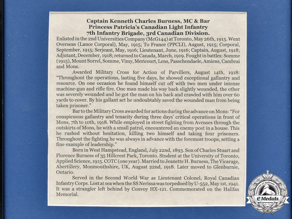 George V. Silver, engraved "Capt Kenneth Charles Burness / P.P.C.L.I. / 1919" on the reverse, measuring 44.5 mm (w) x 48.5 mm (h) inclusive of its integral suspension, original ribbon suspended from a pinback hanger, reverse-mounted under glass with a brief biography which includes his two citations, within a 280 mm (w) x 355 mm (h) frame, extremely fine.