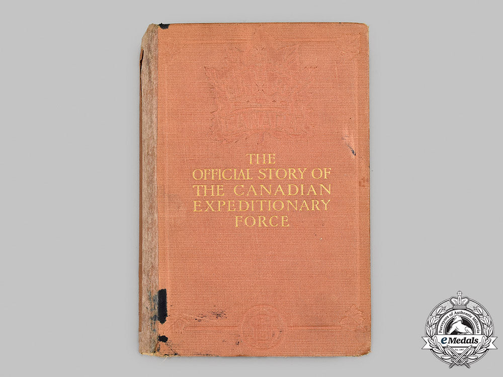 Hardcover, salmon-coloured cloth cover, entitled "The Official Story of the Canadian Expeditionary Force, Volume I", by Sir Max Aitken, M.P., the front cover and spine with the text in gold-coloured ink, the front cover embossed with a large Canada General Service badge at the top and the Hodder and Stoughton publishers insignia at the bottom, the two linked by a rule forming a rectangle with a maple leaf in each corner, the spine with a small embossed Canada General Service badge, published by Hoffer and Stoughton of London, Toronto and New York in 1916, marked as "Thirteenth Edition (Illustrated)", printed in Great Britain by Richard Clay & Sons, Limited of London and Bungay, Suffolk. The author of the book states: "To the officers and men now serving in the Canadian Expeditionary Force in Flanders, and to the memories of those who have fallen, I dedicate this little book." It is stamped in blue ink "Unique Bookstore" on the endpaper on the inside front cover, along with a "$50." price point in black ink. It begins with a Preface by the Right Honourable Bonar Law, M.P., LL.D., Secretary of State for the Colonies, followed by an Introduction by the Right Honourable Sir Robert Borden, G.C.M.G., M.P., LL.D., Prime Minister of Canada, an Author's Note by Sir Max Aiken, M.P., a Table of Contents and is divided into ten chapters: I - Mobilisation; II - Warfare; III - Neuve Chapelle; IV - Ypres; V - A Wave of Battle; VI - Festubert; VII - Givenchy; VIII - Princess Patricia's Light Infantry; IX - The Prime Minister; X - The Canadian Corps. It concludes with six Appendices (The King's Messages to the Canadians; Canadians in Deptaches; The Prime Minister and the War; Lieut.-General E.A.H. Alderson, C.B., Commanding the Canadian Corps; Honours and Rewards Granted; Statement of Casualties) and nineteen Extracts from Press Opinions of Canada in Flanders. The book contains 272 pages of detailed and descriptive text, along with line drawn maps, printed in black ink, on a thick newsprint paper stock, with a fold-out map of the Ypres area placed between pages 46 and 47, complimented by multiples pages with illustrations and photographs of individuals and war-torn sites inserted at eighteen locations throughout the book and printed in black ink on a white semi-coated paper stock, measuring 135 mm (w) x 198 mm (h) x 40 mm (d). It exhibits extensive wear and soiling on the cover, with reinforcing tape in place along the spine where it butts both the front and back covers, scattered spotting present on a few pages inside, however, most of the text pages along with the illustrations remain unaffected. Good.