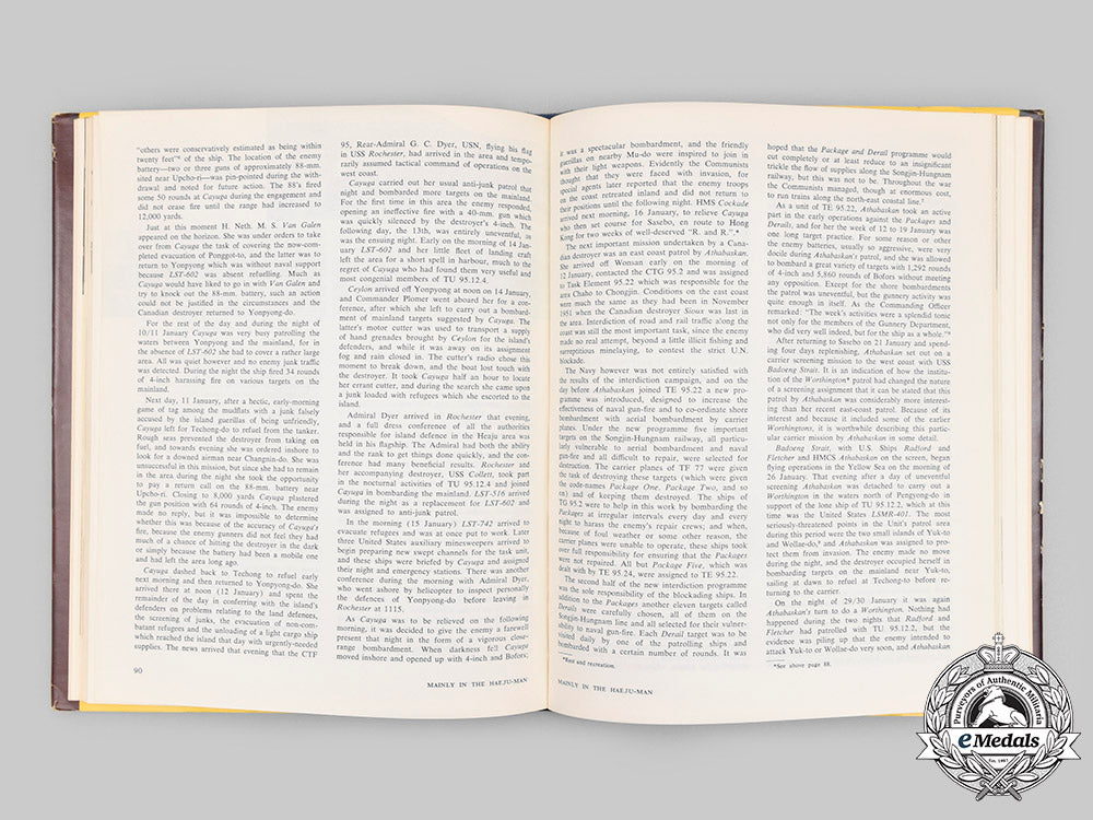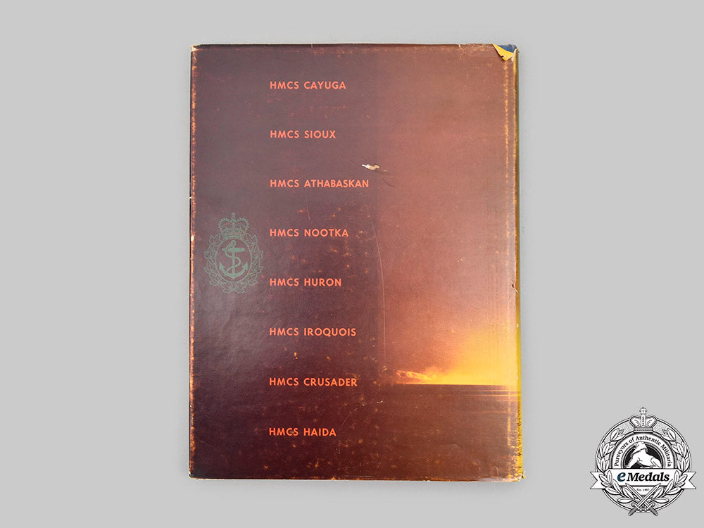Hardcover, cobalt blue cloth cover, with paper dust jacket, entitled "Canadian Naval Operations in Korean Waters 1950-1955" by Naval Historical Officer Thor Thorgrimsson and Naval Historian E.C. Russell, copyrighted by Crown Copyrights, Roger Duhamel, F.R.S.C. (Fellowship of the Royal Society of Canada), Queen's Printer and Controller of Stationery of Ottawa, Canada in 1965, Catalogue No. DB3-9265. It is stamped in black ink with the previous owner's name on the cover page. As stated on the dust jacket: "For three full years and more, the Korean "police action" - a war in all but name - raged throughout the length and breadth of that unhappy country known to its people as the Land of the Morning Calm. For three years a division of Canadian destroyers served with the naval forces of the United Nations, engaging in what was undoubtedly one of the most unusual naval campaigns in history - a campaign in which the ships of the UN never even sighted an enemy craft worthy of the name of warship. This book tells the story of the Canadian destroyers in this peculiar war and describes how they duelled with the sharpshooting Chinese gunners of Amgak and Wonsan; how they shepherded fleets of little wooden junks and sampans filled with wild guerillas. going raiding in the ancient Viking fashion; how they bore aid and secour to starving Korean islanders whose livelihood had been destroyed by war. It describes the monotony of interminable carrier-screening missions and the excitement of hazardous blockade or island-defence patrols carried out in blinding snow squalls and biting winds anong the rocky shoals and mud banks of the Korean west coast. The book tells, too, how one of Canada's destroyers won Task Force 95's coveted "Trainbusting Championship" in competition with the ships of all the United Nations and how another Canadian ship, in a more mundane sphere, won yet another championship in the "Yellow Sea Fuelling Stakes." The story of Canada's navy in Korea is the theme of the book, but the broader history of the war is not forgotten. The epic struggles on land, in the air and at the conference table, and the effects of these struggles on the naval war, are kept before the reader throughout." A note on page ii states: "In the writing of this volume the authors have been given full access to relevant official documents in possession of the Department of National Defence; but the inferences drawn and the opinions expressed are those of the authors themselves, and the Department is in no way responsible for the reading or presentation of the facts as stated." The book features five maps: a map entitled "Pengyong-Do to the Haeju-Man" on page 86, the inside front cover with two maps (one of Korea in relation to East Asia, the other with a map of Korea with important places marked on it), the inside back cover with two large close-up maps of Central Korea with the headings "Task Elements and Patrol Areas, West Coast Korea - March, 1952" and "Task Elements and Patrol Areas, East Coast Korea - March, 1952", respectively. It begins with a Table of Contents, followed by a Preface, Bibliographical Notes and is divided into eleven chapters: I - "Three Ships West"; II - From Pusan to the Yalu; III - The Chinese Intervention; IV - Stopping the Chinese; V - Offensive and Counter Offensive Ashore; VI - The Island Campaign Begins; VII - Defending the "Friendly Islands"; VIII - Mainly in the Haeju-Man; IX - Stalemate on the "Island Front"; X - "Trainbusting" on the East Coast; XI - The Uneasy Truce. It concludes with ten Appendices (A - Organization, Administration and Supply of the RCN Destroyers in the Korean Theatre; B - Senior Officers of the Canadian Destroyers in the Far East 1950-1955; C - Service of HMC Ships to Korean Waters; D - Honours and Awards for Service by Officers and Men of the Royal Canadian Navy in the Korean Theatre, 1950-1955; E - The Command Organization, UN Naval Forces, Korea, 19 February to 3 April, 1951; F - The Command Organization, UN Naval Forces, Korea, 10 April, 1951; G - Organization of Task Group 95.1 on the West Coast of Korea, Effective 1 January 1953; H - Bibliography; I - Diagram - Periods of Service of HMC Destroyers in Korean Waters; J - Glossary of Technical Terms and Abbreviations) and an extensive thirteen page Index. The book contains 176 pages printed in black ink, loaded with descriptive text and multiple photographs, on a white paper stock, the five maps printed in cyan and cream-coloured inks, measuring 213 mm (w) x 277 mm (h) x 16 mm (d). It exhibits foxing on the top of the pages, with wear and scuffing present on the paper dust jacket, the pages of the book remaining pristine. Better than very fine.
