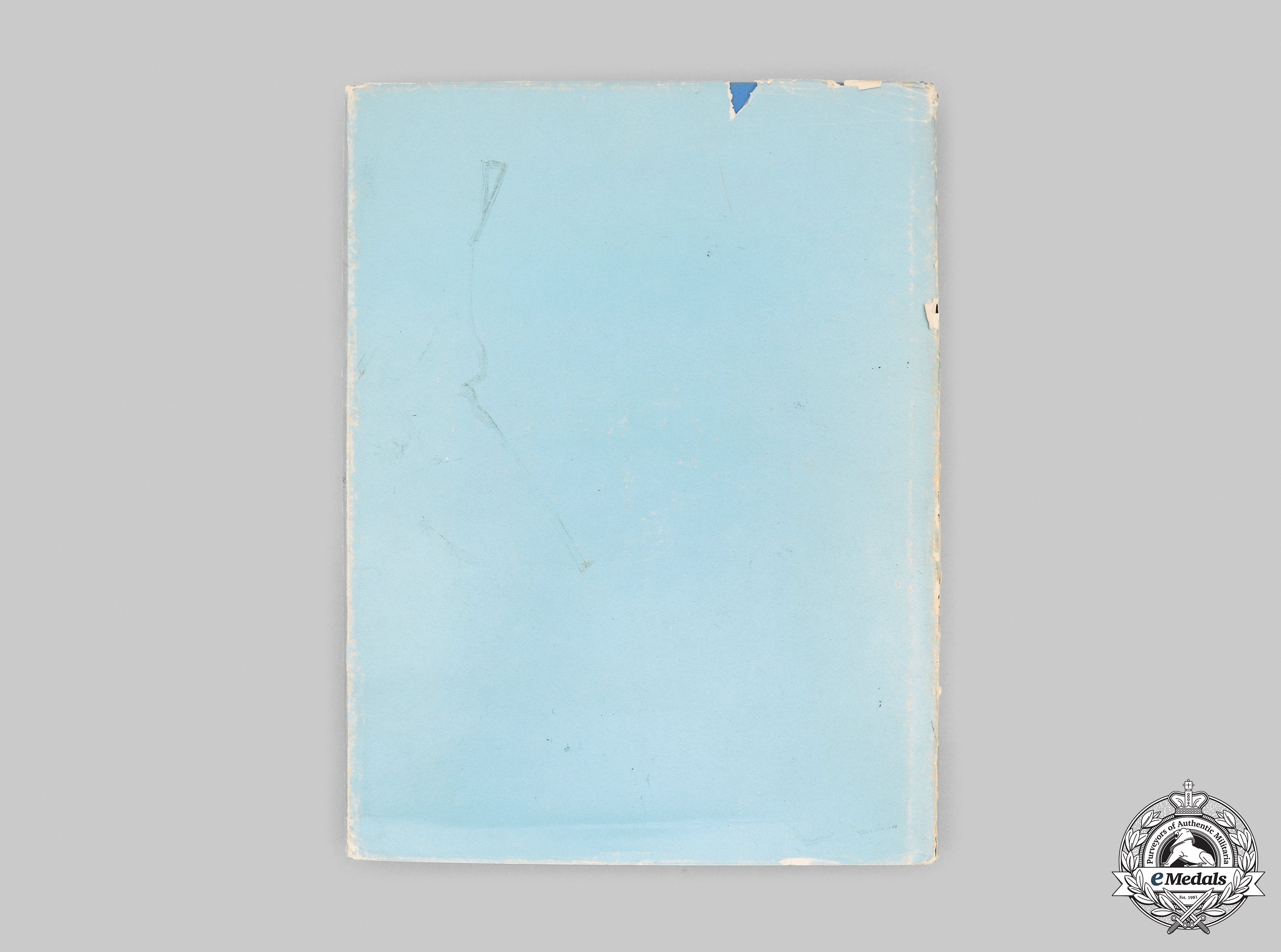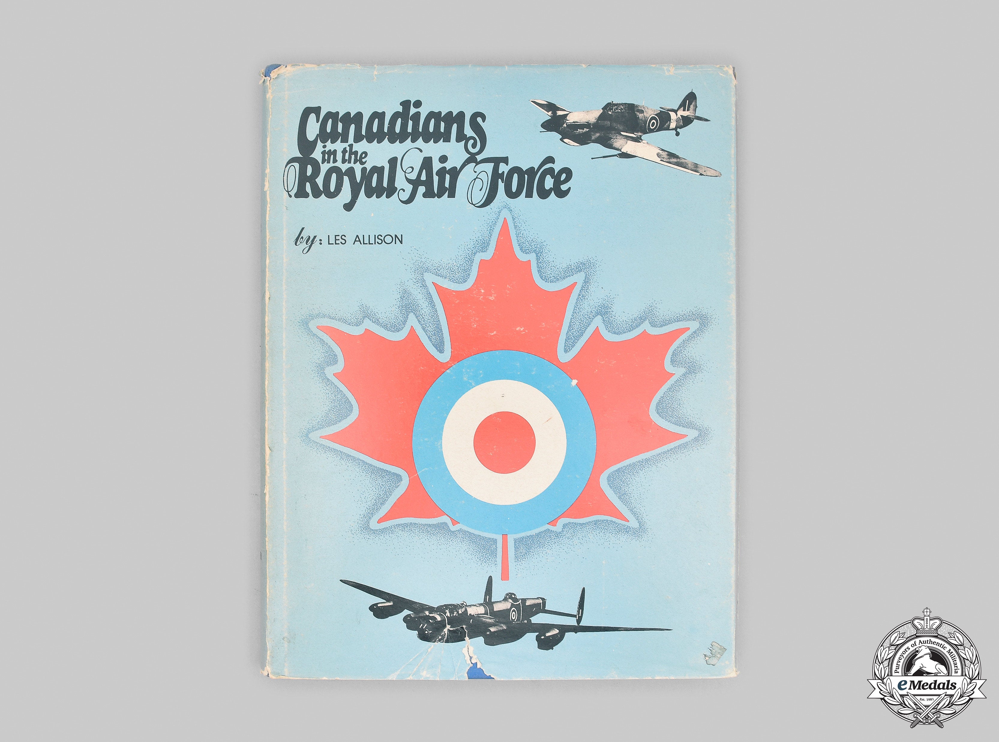 Hardcover, azure blue cloth cover, with a paper dust jacket, entitled "Canadians in the Royal Air Force" by Leslie Andrew "Les" Allison, published by Les Allison of Roland, Manitoba in 1978, printed in Canada by Friesen Printers of Altona, Manitoba, ISBN 0-919213-91-X. The inside front cover endpaper is signed in blue ink by the author, "Les Allison / Roland, Man. / 1980" and is stamped in black ink with the previous owners' name. As described on the dust jacket: "This is a list of Biographies of some 2,000 Canadians who joined the Royal Air Force mainly before W.W.II. It also contains 35 short stories of those from the Air Force who were involved in flying and combat which may be described as heroic, tragic, bizarre and controversial. Numerous other statistics are also included. The accomplishments of this small group were many times greater than any other similar company. They suffered 50% casualties, but earned over 600 decorations. Their contribution to the cause in the first year of the war, when numbers of trained men were so scarce, has never before been assessed. Certainly the Battle of Britain could have been lost without their help. The 126 Canadians who flew Hurricanes and Spitfires in fighter command during this four month critical battle may well have turned a possible defeat into a British Victory. Those many hundreds of Canadians who flew bombers with bomber and Coastal Command, were in constant action against enemy targets in this same period. They suffered even higher casualties mainly because they had to raid enemy airfields, invasion barges and military targets, plus even Berlin, quite often in daylight. And they had no fighter protection because every fighter was desperately needed in Britain." The book begins with a A Pilot's Prayer, followed by a Foreword, a Table of Contents, an Introduction, an Acknowledgements, a Non Acknowledgements, a Prologue and a Preamble. It encapsules thirty-five short stories, along with many pictures of the men at leisure, at work, in POW camps, many of aircraft on the ground and in flight, plus five pages of statistics. The bulk of the book totals 110 pages and is devoted to the biographies of the over 2,000 Canadians who served in the Royal Air Force, some brief, others expanded upon where the information is known, interspersed with photographs of the individuals. Each biography states the individual's name, his hometown, his rank, his serial number, details their service in the RAF, any awards received, noting whether they survived or were killed, and their burial location. It concludes with a section entitled Events, Incidents & Information, and a five page Register of Hometowns, the four page Epilogue listed in the Table of Contents missing. The book contains 236 pages, enhanced with multiple photographs complementing the detailed text, printed in black ink, on a white paper stock, measuring 220 mm (w) x 285 mm (h) x 20 mm (d). The dust jacket exhibits extensive wear, tearing and discoloration, the book itself with a slight warp in the front cover, foxing on the bottom of the pages, with light staining on pages ix-x, the remaining pages on the interior unaffected. Very fine.