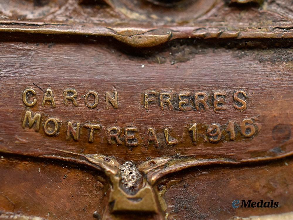 In browning copper, voided, maker marked "CARON FRERES MONTREAL 1916" on the reverse, measuring 44.2 mm (w) x 48.7 mm (h), both lugs are pinched but are intact, near extremely fine,