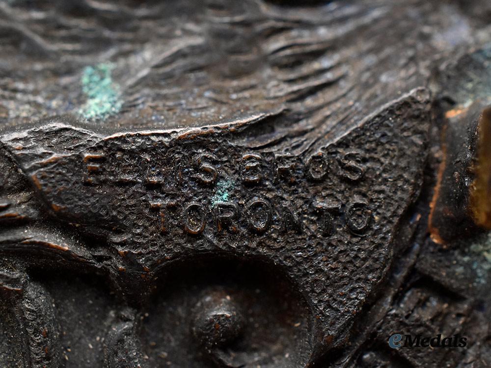 In blackened browning copper, maker marked "ELLIS BROS TORONTO" on the reverse, measuring 38.5 mm (w) x 47.3 mm (h), both lugs intact, very light contact, near extremely fine.