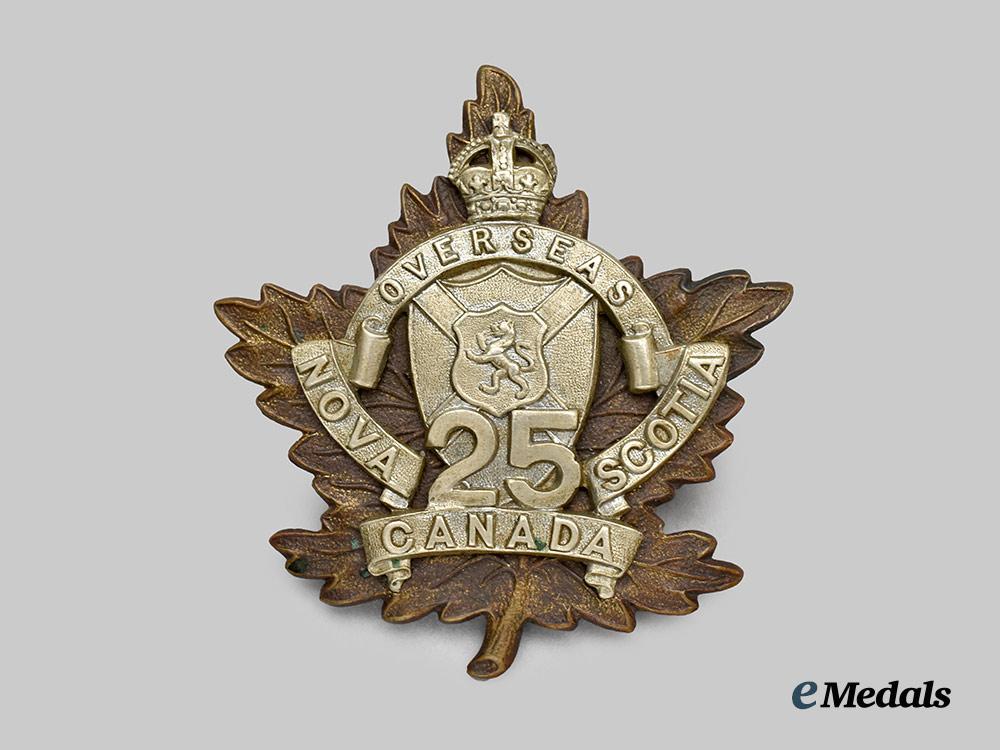 Footnote: The Battalion was raised in Nova Scotia and mobilized in Halifax under the authority of G.O. 36, March 15, 1915. The Battalion sailed May 20, 1915 under the command of Lieutenant-Colonel G.A. LeCain with a strength of 42 officers and 1,081 other ranks. The Battalion served in France and Belgium with the 5th Infantry Brigade, 2nd Canadian Division. It was disbanded on September 15, 1920.