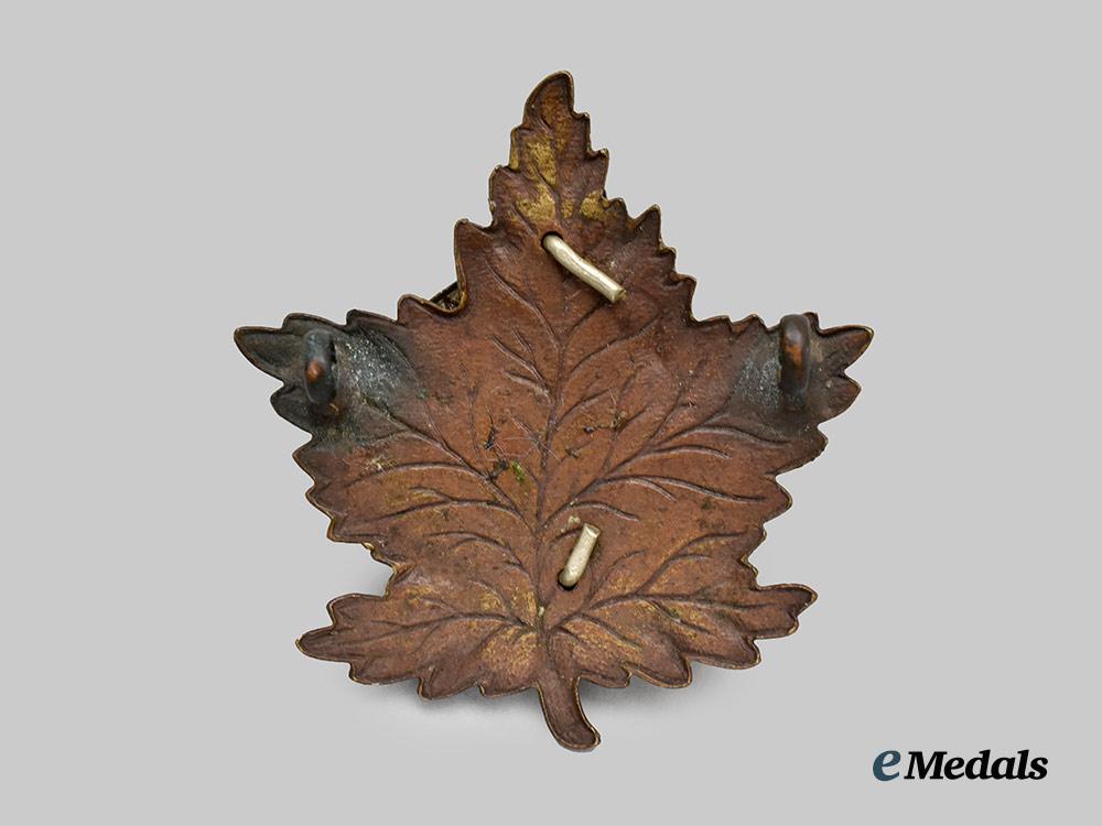 Two-piece construction, white metal insignia, mounted to a browning copper maple leaf base, unmarked, measuring 45.7 mm (w) x 48.8 mm (h), both lugs intact, extremely fine.