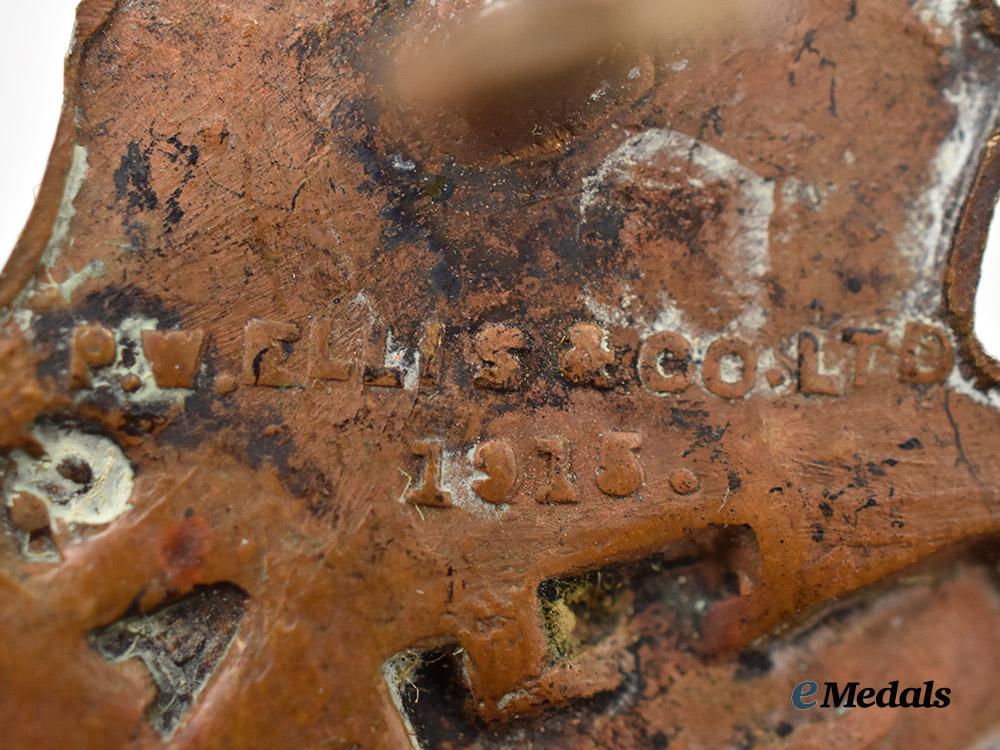 In browning copper, maker marked "P.W. ELLIS & CO. LTD. / 1915." on the reverse, measuring 52.3 mm (w) x 49.3 mm (h), both lugs intact, very light contact, near extremely fine.